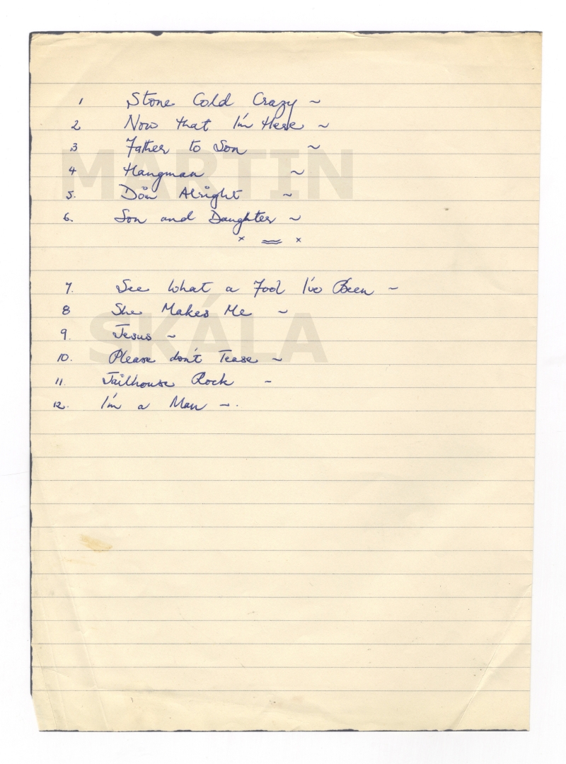 | Setlist: | Stone Cold Crazy, Now That I'm Here, Father To Son, Hangman, Doin' Alright, Son And Daughter, See What A Fool I've Been, She Makes Me, Jesus, Please Don't Tease, Jailhouse Rock, I'm A Man |