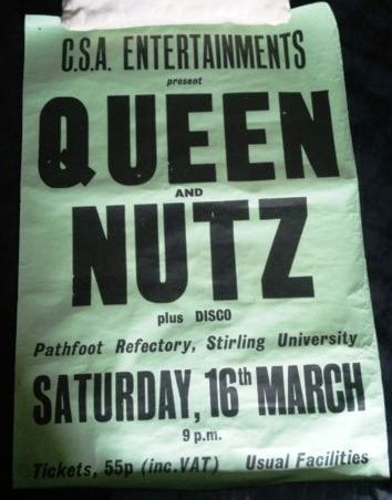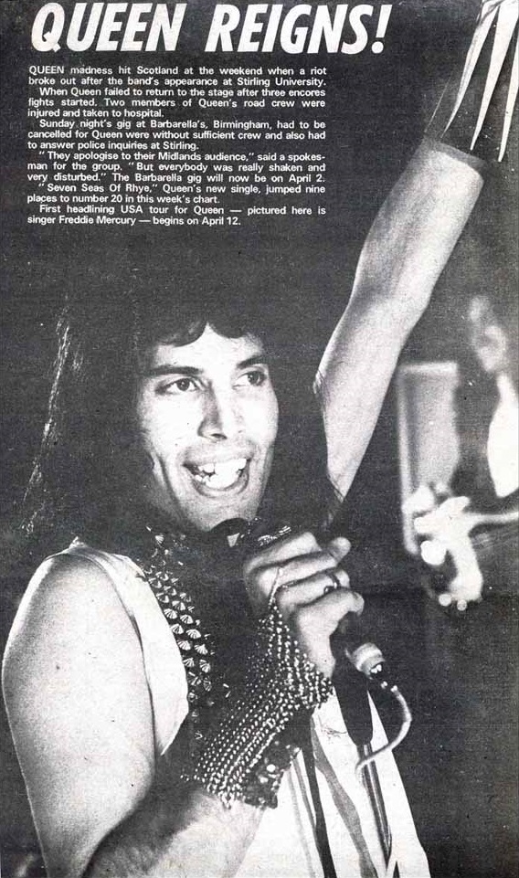 A review of the show reveals that Queen refused to come on for a fourth encore, leading to a riot during which two people were stabbed and a couple crew members were hurt. The band were locked up in the kitchen backstage during the mayhem. Cushions, bottles and beer cans were thrown around amidst the chaos. The scan of the poster was submitted by David van Dijk. Here's a translation of a second review of this show from a German magazine: Today we introduce England's new Supergroup "QUEEN" THEIR SHOW WAS TOO HOT For about four years QUEEN have worked as a warm up act for superstar bands. Now they join the circle - because of their hit "Seven Seas of Rhye." Freddie Mercury acts wild on the stage, playing with his microphone, shaking his long black hair and sings "Seven Seas of Rhye." Then it happens - about one hundred fans storm the stage at this Edinburgh [ed. actually Stirling] show. Freddie escaped with a jump off the stage. Roger Taylor (drums) and two roadies didn't have that much luck. The fanatic fans run over them and they get injured, so the show ends up in hospital for them. "That's crazy" said Freddie after the mob has calmed down. They couldn't go on with the show cause their sound system was heavily damaged in the riot. "We've played together for four years now, started in small clubs, and since about a year, we work as warm up acts for harder rock groups like "Mott the Hoople" ... but I've never seen anything like this. I have to be more gentle and not drive the people that wild - otherwise we'll get banned from British stages. And that we don't want." Responsible for all that - Their hit "Seven Seas of Rhye." Within two weeks that song gave them the status as the new "QUEEN" of the British rock camp. "Now we want to get famous in Europe and America - but without any riots. We don't support that kind of thing. Our song is about peaceful and nice things in a fantasy land called Rhye" said Freddie. An audience tape of this show exists, but it is in rough shape and in need of baking. |