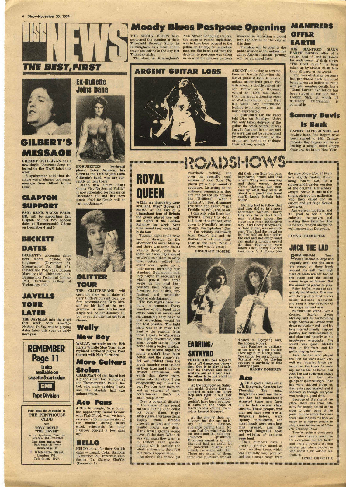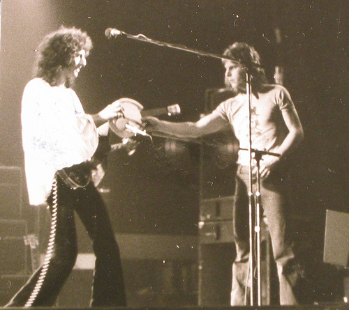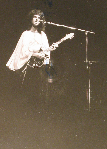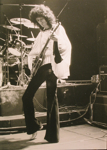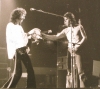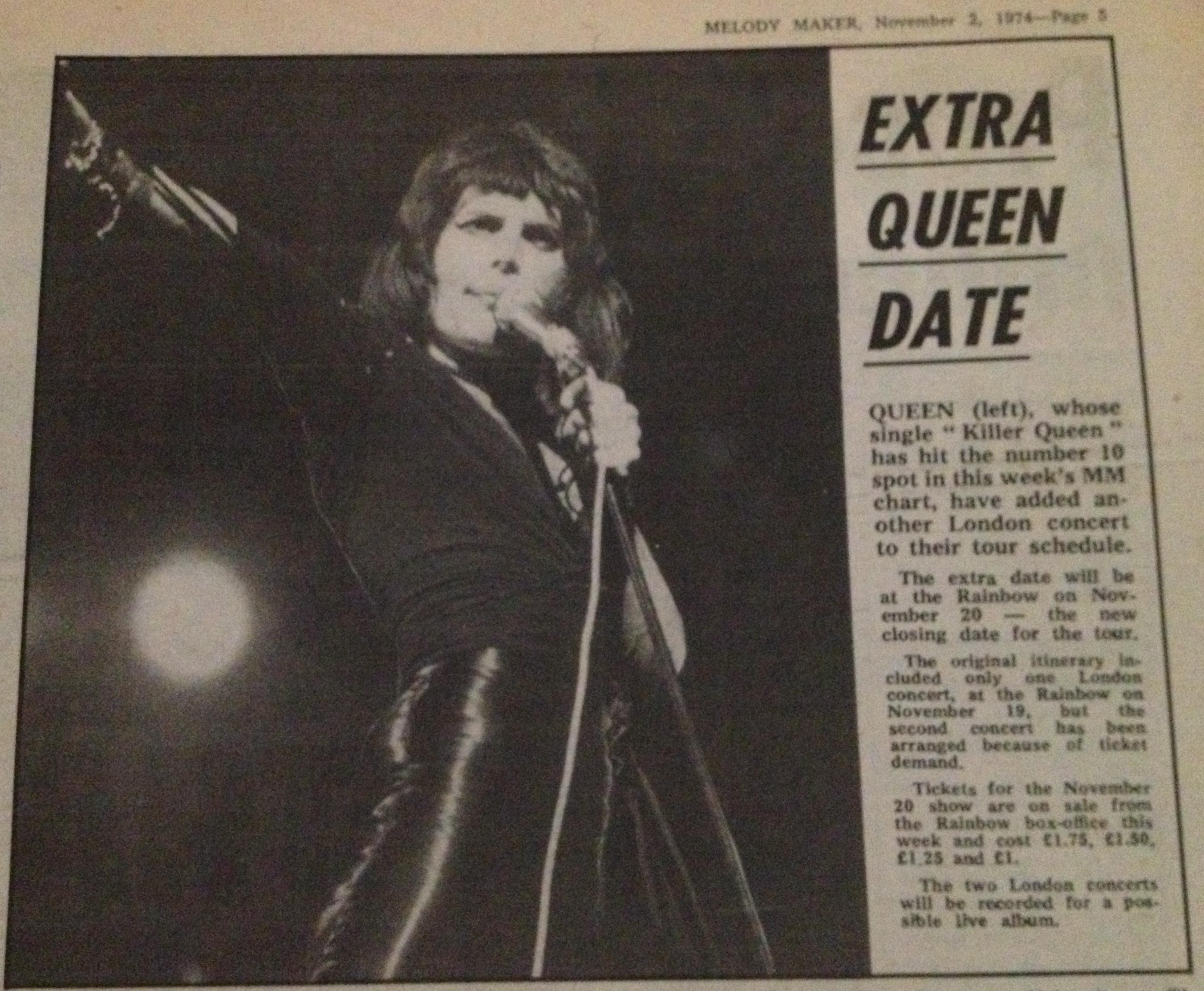 This article from the November 3 Melody Maker confirms that the second night at the Rainbow Theatre was not initially planned but later added (thanks to Ferdy for the scan). The first night sold out in two days, and as of October 8 the second night had not yet been added, as confirmed by Bob Harris on the Old Grey Whistle Test. "Have you all got your black fingernails?" asks Freddie after the second song. "Who's got the white ones?" He is referencing the white and black theme from the Queen II album artwork, now fully realized in their stage outfits. "What a lovely load of darlings. My dearies. Right now we'd like to do... I'll tell you what, a delicate little number for all you delicate people who turned up tonight." Suddenly he raises his voice: "By the way, how's the front balcony? How are you doing?" He then introduces White Queen. Freddie, after Seven Seas Of Rhye: "Do you like my claws? They're real diamonds. It's a present from the devil himself. You don't believe me. They don't believe me! Right, now we'd like to do some rock 'n' roll, a la Queen." At this point on the VHS the audio cuts to the first night and Freddie introduces Stone Cold Crazy. Rosemary Horide, who had previously reviewed Queen very positively numerous times, had a review of the two shows published in the November 30 issue of Disc. She stated that the first night could have been a disaster as the soundboard blew up on the afternoon of the show, and that on the second night the sound cut out during Liar, leaving Roger Taylor with no option but to do a "virtuoso drum display" whilst things were being fixed. Furthermore, she is wrong in stating that Queen would do four nights in London the next time around - it'd actually be six. Thanks to Jane Palm-Gold for the initial information and to Musicland Munich for the scan. This may well explain why only part of Liar is seen on the VHS release. "Anybody who'd like to pose with us is cordially invited onto the stage," says Freddie as Roger does his impromptu drum solo. This footage didn't stay under guard forever, though, as it was seen on the extras of the UK blu-ray release of the "Days Of Our Lives" documentary in 2011. The power actually went out twice, and John Deacon, an electrician by trade, is clearly frustrated the second time. This story about the power going out during Liar had been previously attributed to the Rainbow Theatre show in March, but this should now clear things up. Queen encountered plenty of technical problems like this in the early years, so it's of little surprise that they later assembled world-class crews to take on tour with them. Furthermore, the band were aggravated by the film crew, whom they felt were impeding their progress of connecting with the audience. Roger Taylor shows his frustration at the end of the show by smashing his drum kit, even going out of his way to knock over his boom stands. This is seen on the video. The pictures seen above were snapped by a crew member, Richard Paul-Jones, ©1974. His pics are almost certainly from both nights, taken from all around the stage. Pic 9 is a great shot of Brian handing his ukulele banjo back to the crew member after his brief solo spot in Bring Back That Leroy Brown. A young Gary Numan attended one of these shows, and recalls: "I stood outside the stage door and tried to get an autograph and they actually invited everybody in – all the people hanging around by the stage door – and they invited them in into the dressing room and signed everything for everybody and I never forgot about that. It was a fantastic lesson in how to look after your fans. So to this day, I sign everything and I go outside and I talk to people and meet people and it all came from that. It was a lesson in how to look after the people who've given you the life you have. I've been to gigs at the Rainbow many, many times and there were so many bands who'd come out of their dressing rooms and the people would be pushed back by their security, throw themselves into a car and they'd leg it and wouldn't talk to anyone and be the big star. Queen? Not that at all. They actually welcomed you in and I thought that was fantastic." |
