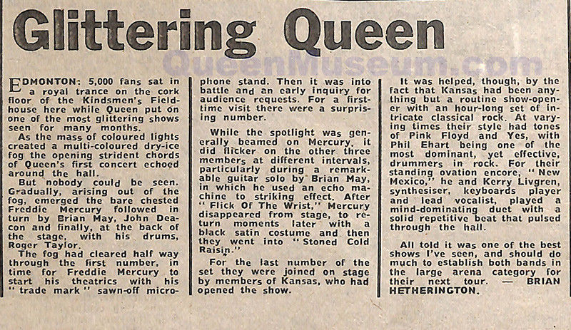 An early tour itinerary listed this show as April 3 and next night's gig in Calgary as April 2. The dates would be swapped. Kansas was the support act tonight, and this review from a Melody Maker later in the month states that some of the members of the band joined Queen on stage, probably for Jailhouse Rock. |