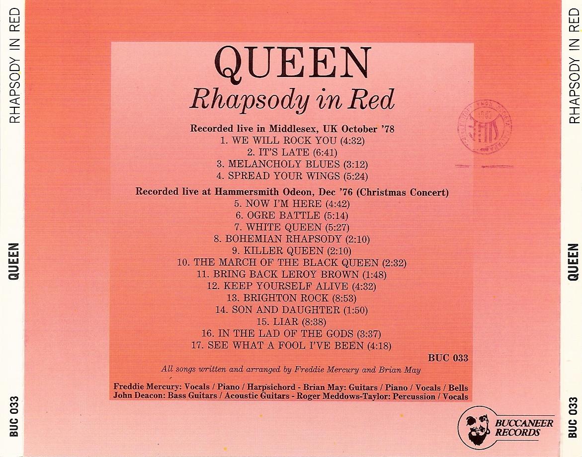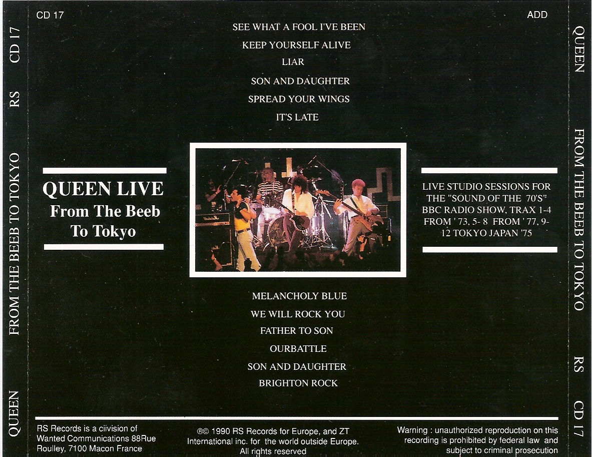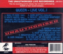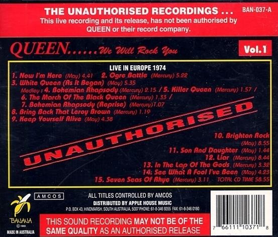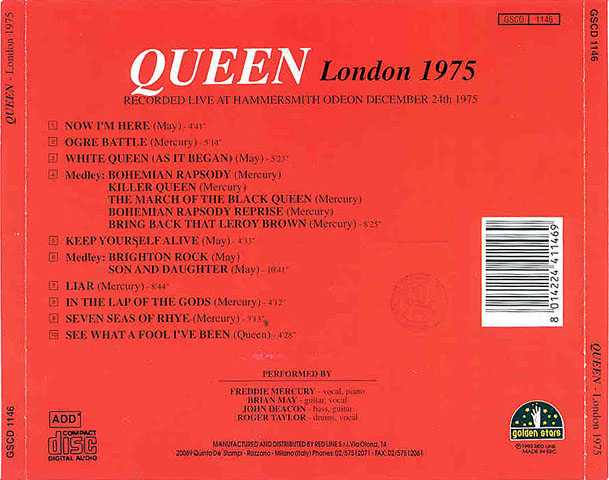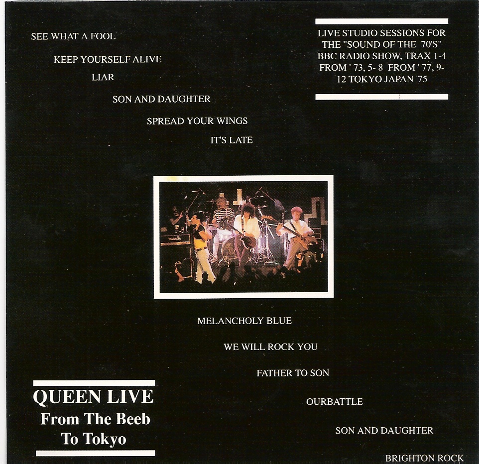 This 1976 bootleg sourced from the Radio 1 broadcast earlier in the year was the first release of this now famous concert, the second Queen bootleg to be released in the US (the first being Sheetkeeckers). The bootleg would be re-released several times through 1982, always containing the same source material. White Queen, Bring Back That Leroy Brown, Big Spender, and Jailhouse Rock are missing. Now I'm Here is misspelled as "Now I'm Sure," and on some versions it's actually edited (about a minute is missing, with the second chorus seamlessly cutting into the third). |