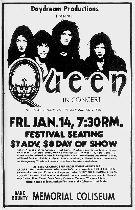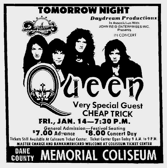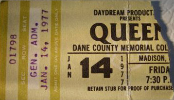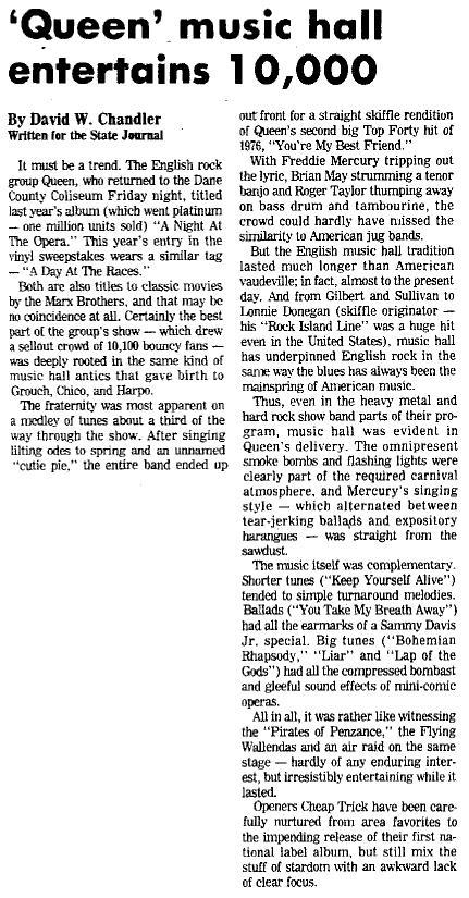 Freddie takes a lot of liberties with the melodies, especially in the first few songs (one of which is Sweet Lady, which would soon be moved to a later spot in the setlist). They haven't yet worked out the harmonies on "I try and I try" in Somebody To Love, and he nails the part on his own. A great version, in only its second performance. Considering how they've said they were nervous doing it the first few times, they sound great here. On some tours they were sloppy the first few nights, but here they're pretty well spotless. Freddie's doesn't have all of his range, but he still sings very confidently and dynamically (although he's a bit conservative in White Man). Not nearly as bad as Richfield a week later. Their front of house tech doesn't have the backing vocals properly dialed in for Killer Queen, but he sorts it out by You're My Best Friend where they blend marvellously. Brian plays some lovely bluesy lines in the heavy section of The Millionaire Waltz. Considering how complex the three new songs to the set are, they're all played well. Freddie introduces Brian after a fantastic and well-paced Brighton Rock solo, and an audience member (as heard on the recording) speaks for the rest of the ten thousand on hand - "fuck yeah!" Also interesting is how Brian gives the same speech for '39 as he did at Hyde Park, but is cool as a cucumber compared to how nervous he was there. Roger sings his line in the middle section about as well as he ever would. Freddie takes requests after The Prophet's Song. "Fairy Feller's Master-Stroke? We gave that up years ago!" Instead they launch into their biggest hit, Bohemian Rhapsody - a wise choice after the ten-minute piece that preceded it. By the last few songs they're into their rhythm and tear the roof off the place. The first six pictures were taken during the opening song for this tour, Tie Your Mother Down. Pictures 4 and 5 particularly were taken during the guitar solo. Here is a review from the next day's Wisconsin Daily Journal. Interesting how one of Brian May's biggest influences, skiffle musician Lonnie Donegan, is mentioned. |
