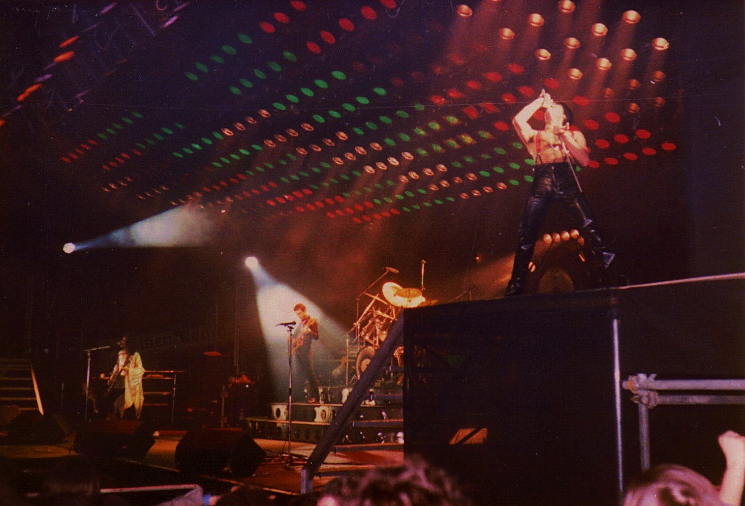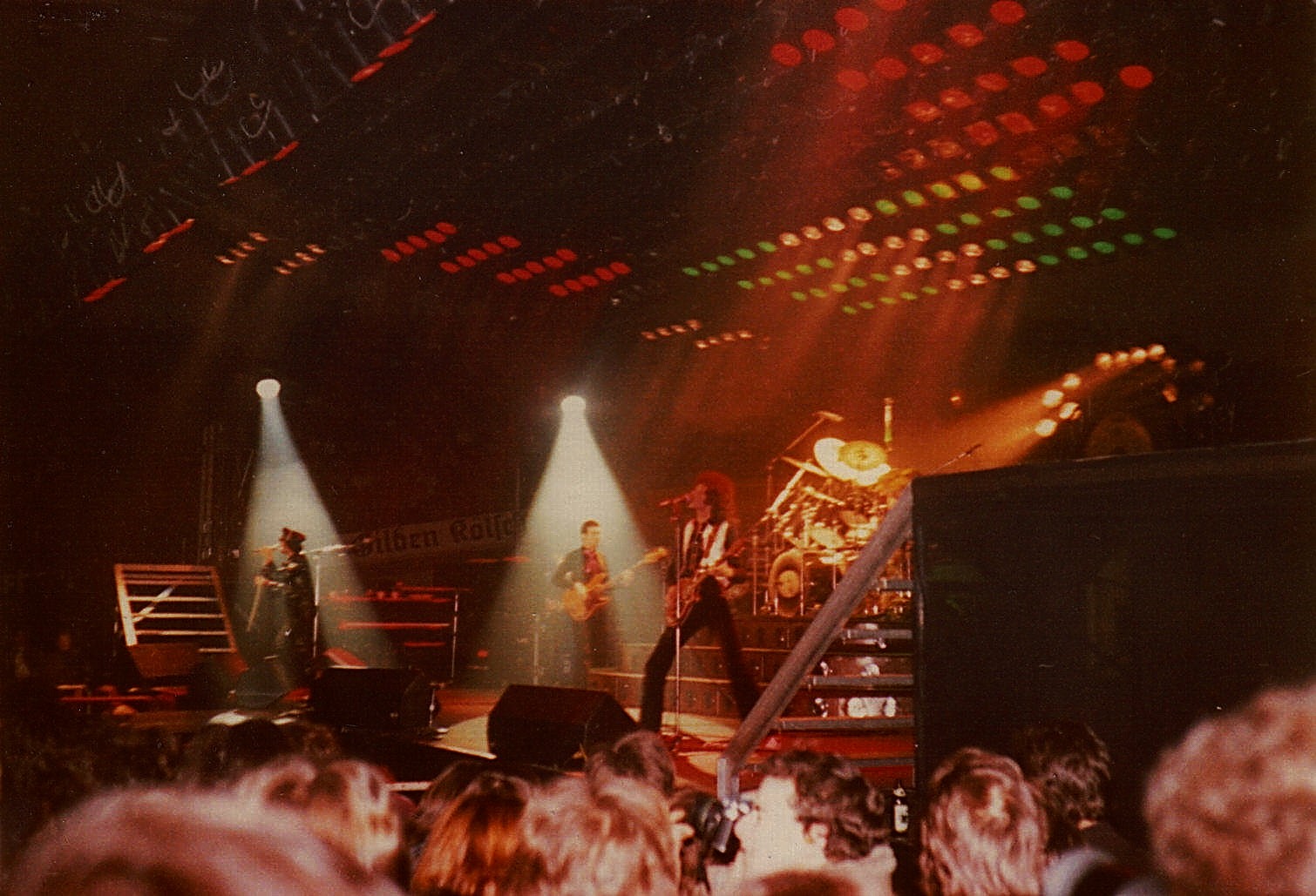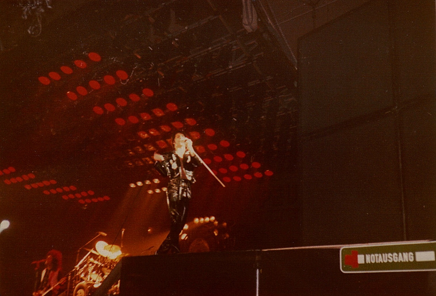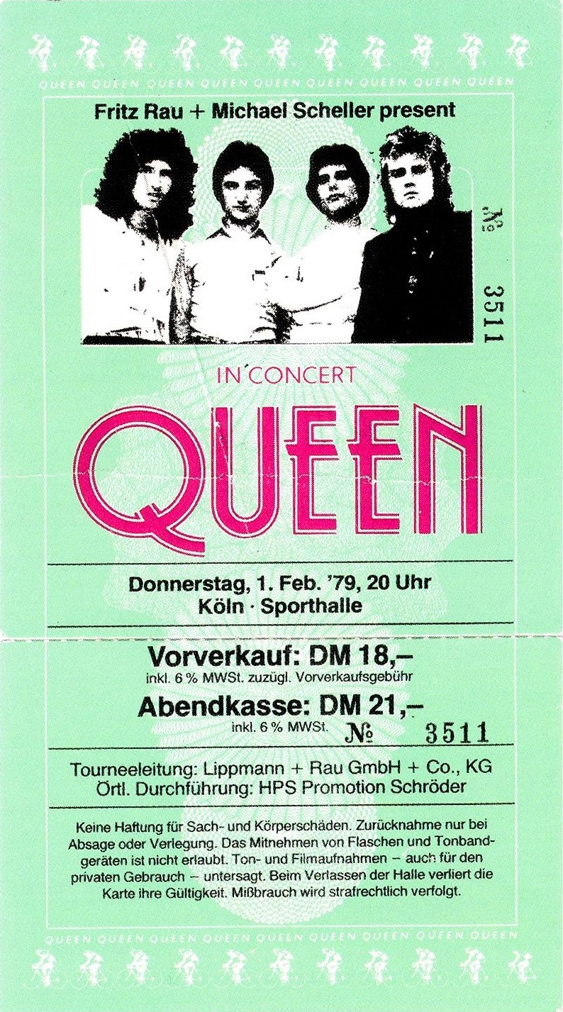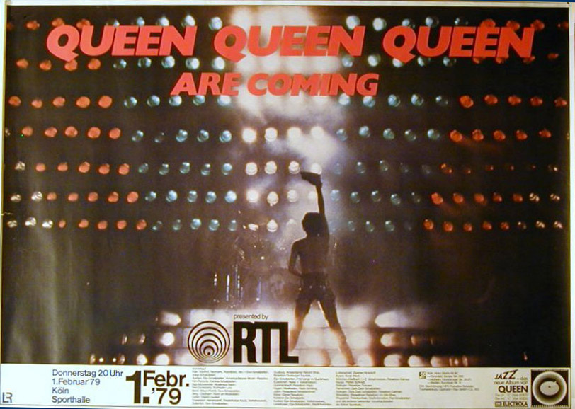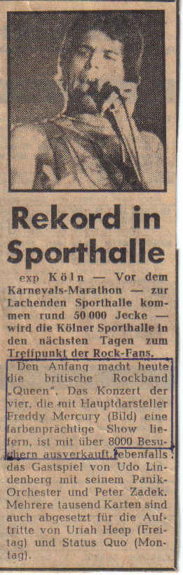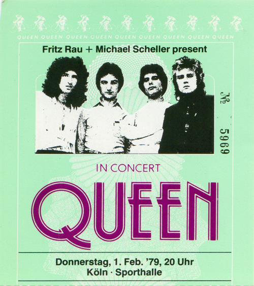This is a pretty energetic show with many wonderful musical and vocal moments, and Freddie sounds relatively strong by early 1979 standards. Highlights of the show include If You Can't Beat Them, Now I'm Here, and Brighton Rock. Mercury attempts to introduce Now I'm Here, but an audience member interrupts him. "No, it's not Tie Your Mother Down. That comes later!" Before Love Of My Life, Freddie says: "We have a song right now that requires a very, very big choir. And that is you. So we're gonna give you the first few lines in this next song, and you can take it wherever you want." After the song, Brian formally introduces Roger and John back to the stage. "And on wondrous vocals, Mr. Freddie Mercury." Freddie forgets most of the words in the first chorus of It's Late. Later he introduces Bohemian Rhapsody from the piano, something he rarely did after the A Day At The Races tour. Brian gives a great performance as well, although his G-string is very out of tune on Sheer Heart Attack (but considering the nature of how the song is performed, it still works). And then at the final peak of the show, just before the final "Of the world" during We Are The Champions, he plays a completely wrong chord, hitting the 7sus4 chord in B instead of C. Here is a brief write-up about the show, referring to a record-setting audience. It also says, "Before the carnival there are a few rock concerts in the Sporthalle, starting off with sold-out Queen and Udo Lindenberg concerts. Uriah Heep and Status Quo sold thousands of tickets for their concerts as well." The first 29 pictures were taken by Wolfgang Trabitzsch (and later colour-corrected by Nino Trovato, along with pics 30 to 32). |