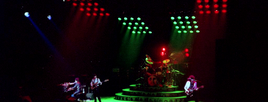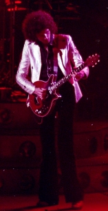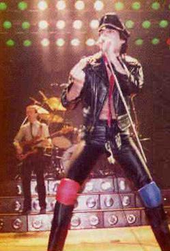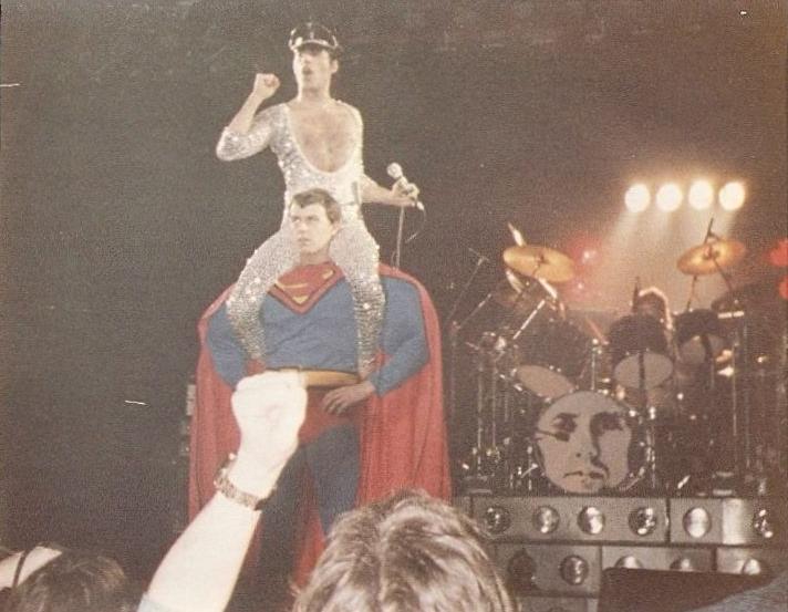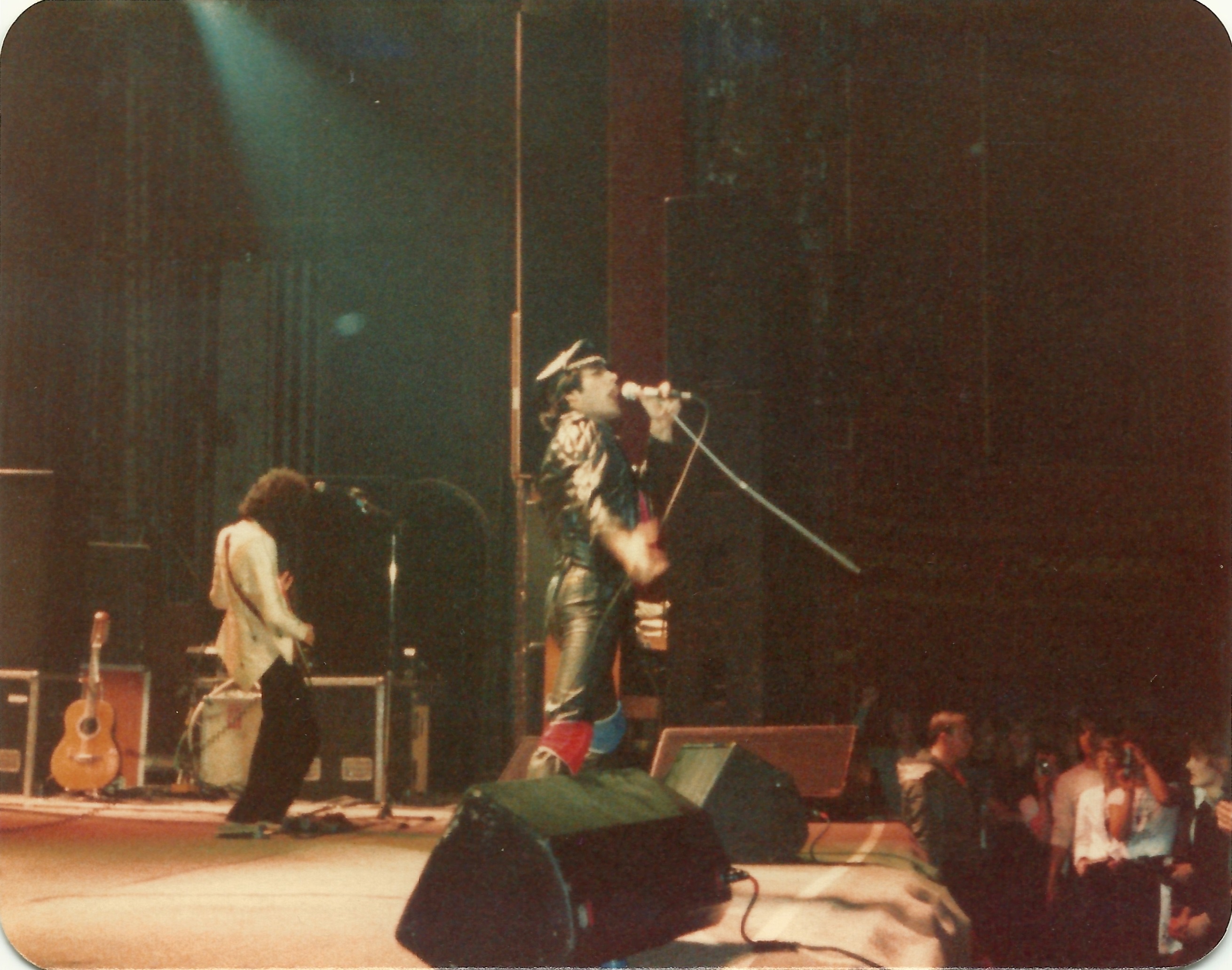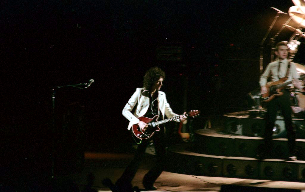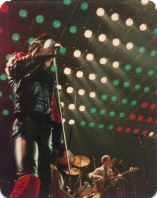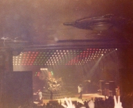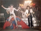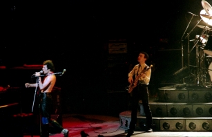 Freddie's black leather pants had both blue and red kneepads just to keep the football fans of both Liverpool and Everton happy, as Brian explained at some point during the show. For their own amusement during the acoustic set, Brian and Freddie played a bit of Mull Of Kintyre after Freddie mentioned how Wings had just played in Liverpool. Freddie jokingly said, "I'll be Linda McCartney." At another point he was toasting the audience with champagne as he did on the first night ("toasting" meaning "dumping it on the audience"), and a fan who attended both shows knew the gag was coming and chucked some water at him first ! The band perform Liar on the second night in Liverpool, as they always did when playing two consecutive nights at a venue on this tour. The first picture was taken by Jim Jenkins, and the second by Ian Stewart Brown during We Are The Champions. The third photo set was taken by Doug Price and cleaned up by Ryan Newton, and the last two sets were taken by Gillian Parry and Gary Moss respectively. The third-last photo by Moss was taken at about the same time as the Jenkins photo (and Jenkins can even be seen taking his shot - thanks to Ed for pointing this out). |