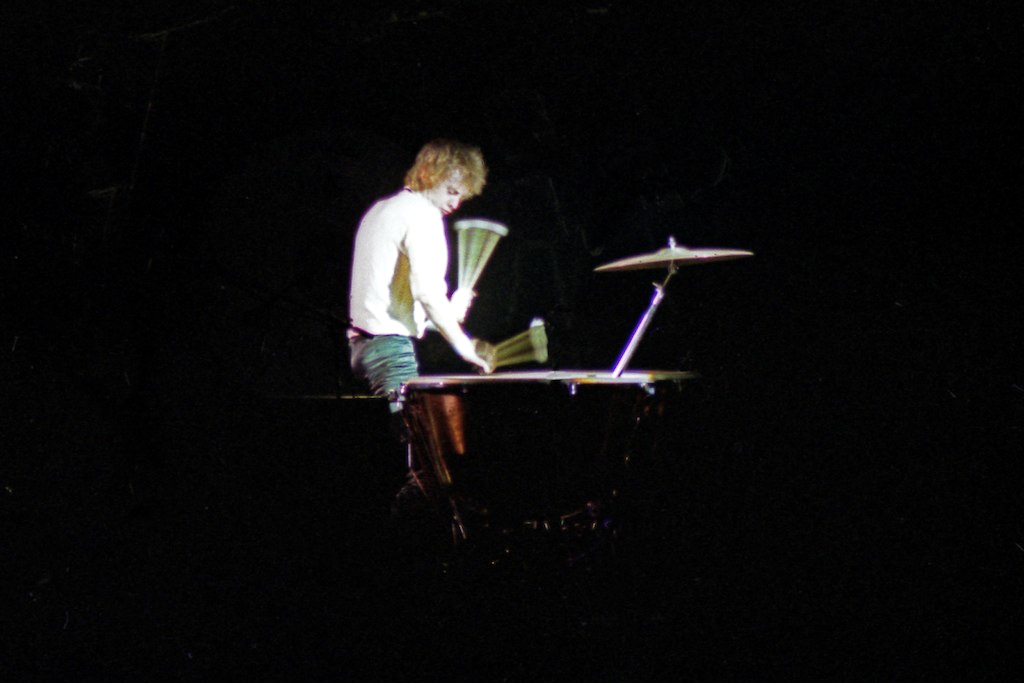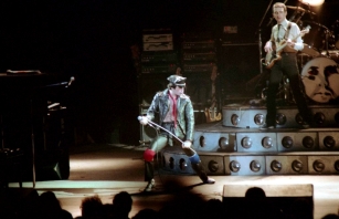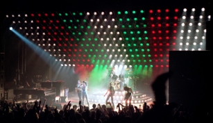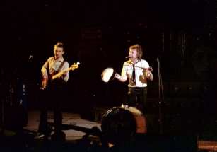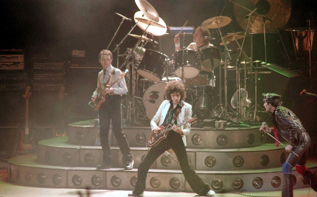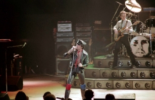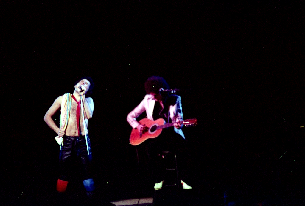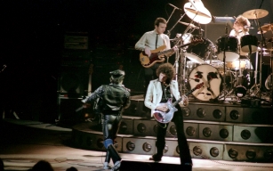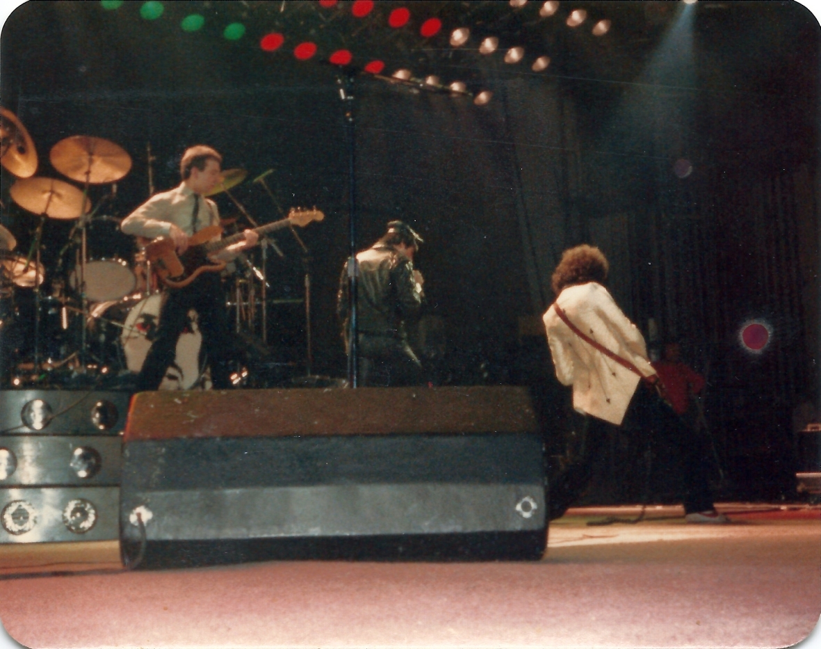 Freddie's black leather pants had both blue and red kneepads just to keep the football fans of both Liverpool and Everton happy, as Brian explained at some point during the show. For their own amusement during the acoustic set, Brian and Freddie played a bit of Mull Of Kintyre after Freddie mentioned how Wings had just played in Liverpool. Freddie jokingly said, "I'll be Linda McCartney." At another point he was toasting the audience with champagne as he did on the first night ("toasting" meaning "dumping it on the audience"), and a fan who attended both shows knew the gag was coming and chucked some water at him first ! The band perform Liar on the second night in Liverpool, as they always did when playing two consecutive nights at a venue on this tour. The first picture was taken by Jim Jenkins, and the second by Ian Stewart Brown during We Are The Champions. The third photo set was taken by Doug Price and cleaned up by Ryan Newton, and the last two sets were taken by Gillian Parry and Gary Moss respectively. The third-last photo by Moss was taken at about the same time as the Jenkins photo (and Jenkins can even be seen taking his shot - thanks to Ed for pointing this out). |