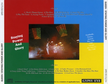 | Track listing: | Flash (tape) [cut], The Hero, We Will Rock You (fast), Action This Day, Play The Game, Staying Power, Somebody To Love, Now I'm Here, Dragon Attack, Now I'm Here (reprise), Love Of My Life, Save Me, Back Chat, Get Down Make Love, guitar solo (including I Go Crazy), Under Pressure, Fat Bottomed Girls, Mustapha (intro) [cut], Crazy Little Thing Called Love, Bohemian Rhapsody, Tie Your Mother Down, Another One Bites The Dust, We Will Rock You, We Are The Champions, God Save The Queen |