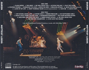 | Track listing: | Flash (tape), The Hero, We Will Rock You (fast), Action This Day, Play The Game, Staying Power, Somebody To Love [cut], Now I'm Here, Dragon Attack, Now I'm Here (reprise), Love Of My Life, Keep Yourself Alive (improv), Save Me, Back Chat, Get Down Make Love [cut], guitar solo [cut], drum solo, Under Pressure, Fat Bottomed Girls, Crazy Little Thing Called Love, Bohemian Rhapsody, Tie Your Mother Down [cut], Another One Bites The Dust [cut], Sheer Heart Attack, We Will Rock You [cut], We Are The Champions, God Save The Queen |