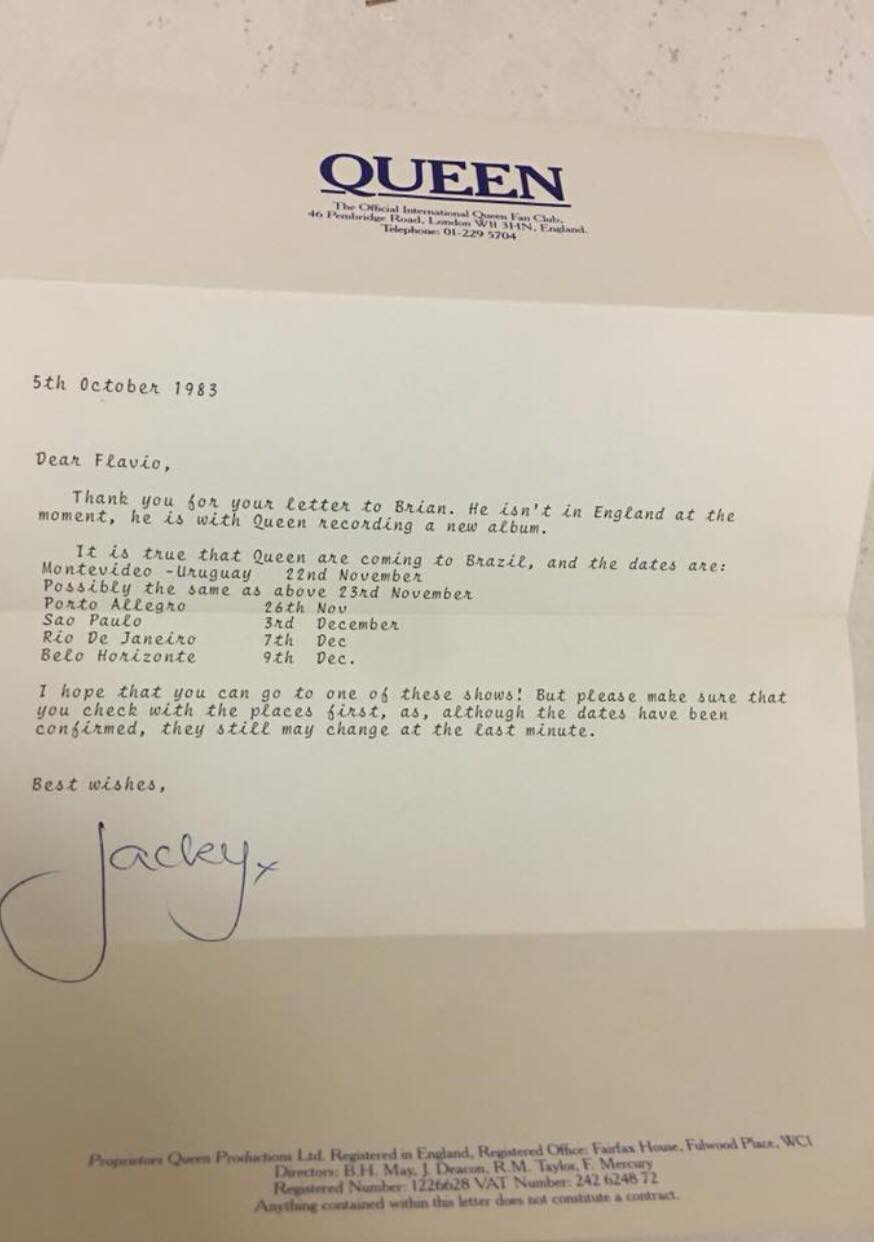 In early 1983 Queen's manager Jim Beach and tour manager Gerry Stickells flew to South America with hopes of arranging a few dates for the band later in the year. The tour proved to be too expensive and dangerous, so it was cancelled very early in the process. This fan club letter clarifies that there were five other dates on the itinerary before they pulled the plug: 1983.11.22 Montevideo, Uruguay 1983.11.26 Porto Alegre, Brazil 1983.12.03 Sao Paulo, Brazil 1983.12.07 Rio de Janeiro, Brazil 1983.12.09 Belo Horizonte, Brazil Queen would ultimately never visit Uruguay. They would, however, return to Brazil to headline two huge shows at the Rock In Rio festival in January 1985. A few gigs in Argentina were also planned for 1983 (initially for January, and then October) but nothing came to fruition because the Argentinian currency continued to fall under the military dictatorship, making it impossible for the band to turn in a profit. On this exact day in November 1983 it turns out the band would film the now well-known video for Radio Ga Ga. The image of the hand clapping done by the mass of people during the chorus would transfer to the concert atmosphere, often creating a spectacular visual effect at (especially the bigger) shows over the next few years. |