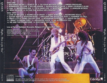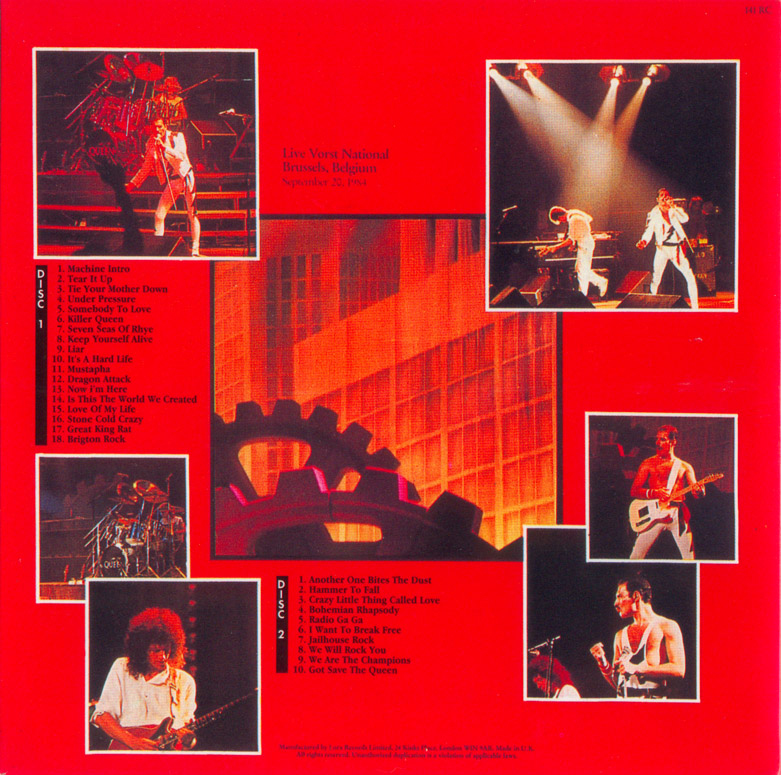 | Track listing: | Machines (tape), Tear It Up, Tie Your Mother Down, Under Pressure [cut], Somebody To Love, Killer Queen, Seven Seas Of Rhye, Keep Yourself Alive, Liar, It's A Hard Life, Mustapha (intro), Dragon Attack, Now I'm Here, Is This The World We Created?, Love Of My Life, Stone Cold Crazy, Great King Rat, keyboard/guitar solos, Brighton Rock (ending), Another One Bites The Dust, Hammer To Fall, Crazy Little Thing Called Love, Bohemian Rhapsody, Radio Ga Ga, I Want To Break Free, Jailhouse Rock, We Will Rock You, We Are The Champions, God Save The Queen |