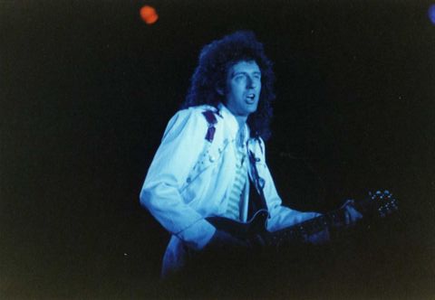 As in all the early Magic tour shows, Freddie is in superb voice. For the first time on the tour, the band exit the breakdown of A Kind Of Magic completely cleanly (on the video, Freddie and Brian are seen talking to ensure they do!), and Freddie is clearly thrilled about it. After the song, he asks, "Where is this? Is this Paris? I just forgot for one minute." Brian, before Love Of My Life: "Thank you for coming. I know some of you have come a long way. We appreciate it." Someone in the audience with a British accent says, "Fucking right there. Play '39 or I'll kill ya!" Freddie forgot a line during the second verse of Hello Mary Lou two nights ago in Leiden, and tonight at that point he quickly and cheerfully admits, "I don't know the fucking words, and I don't care!" Brian would sing the next couple lines of the song for the remainder of the tour, with Freddie happily queuing him in at the first few shows. Freddie does his customary vocal exchange with the audience after Tutti Frutti. Like the last show, at the end of it he says "Fuck you", but tonight he adds, "You're supposed to say fuck you back!" Only half of Friends Will Be Friends is performed for the remainder of the tour. The band probably thought the song dragged on for too long, and thus they decided that playing part of the song served its purpose in the second encore. As a truly majestic gesture, at every gig on the tour from here onward (minus only the show in Ireland) Freddie Mercury comes out at the end of the show dressed up as the Queen of England, complete with the robe and crown (a replica of St Edward's Crown later worn by King Charles at his 2023 Coronation) - as seen in the fourth picture above. At some shows he and the others in the band would toss the crown amongst each other. A couple minutes of soundcheck footage exist (One Vision and Tie Your Mother Down), but unfortunately most of the audio has been replaced by the studio versions. About a minute of One Vision from the show was aired on French TV a few hours before Queen took to the stage in Frejus.