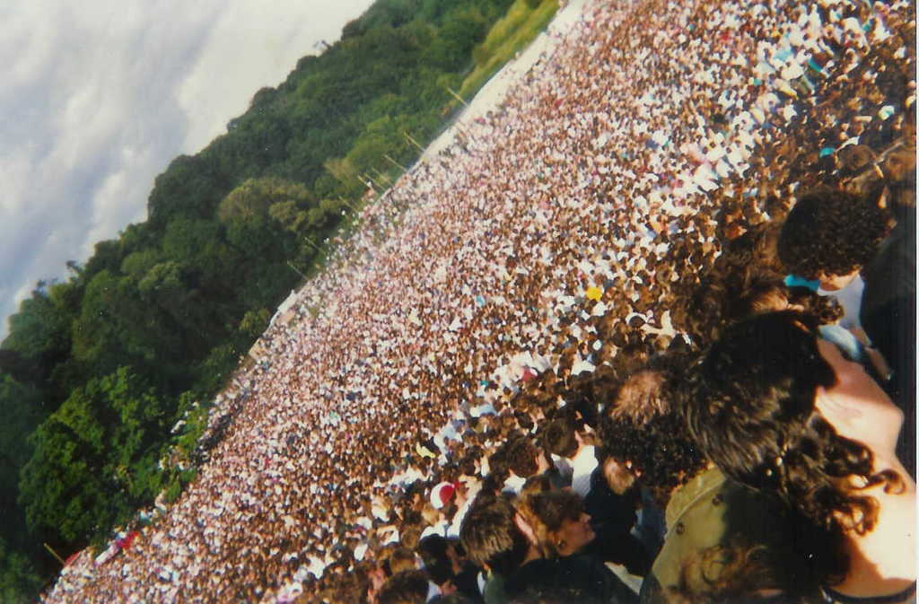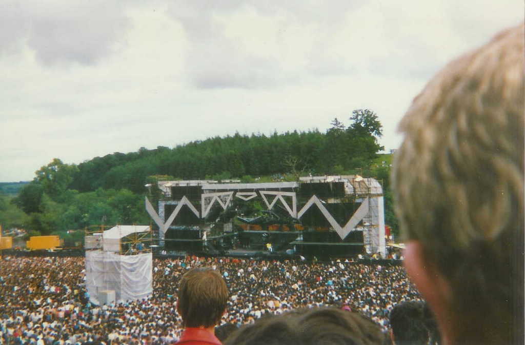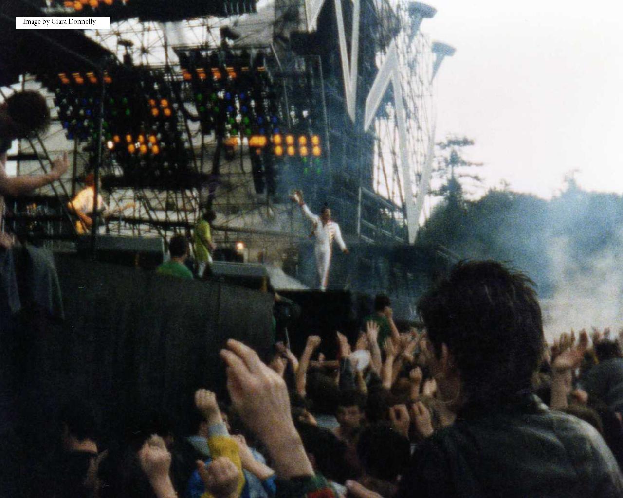Nearly 100,000 people poured into the grounds (and plenty without tickets) starting when the gates opened at 9am - a full nine hours before Queen were due to appear, and four hours even before the first supporting group was due on stage. Some brave souls came up the River Boyne in canoes, trying to get in the back way! With plenty of people admitting themselves into the show like this, it's impossible to calculate an accurate attendance for the gig. But the paid attendence of 92,000 was the largest for a show in Slane to date; even bigger than Bruce Springsteen's concert the previous year. A fan recalls there wasn't much atmosphere to begin with because the show began and ended in daylight, due to a lack of lighting on the Slane site. Plenty of people in the audience got drunk and, combined with the steady rainfall, it led to some problems all afternoon. It began with various objects being thrown at the opening acts. Suzanna Hoffs of The Bangles said at one point, "We're sorry you're getting wet. We are too, but at least you can't get electrocuted!" Sam Coates was in the audience and recalls, "One thing I clearly remember was a guy getting on stage and running at Freddie. Freddie very cool; he put his arm around him and walked him down the steps and led him to the security staff who escorted him off-stage." Around this point he tapped a security guy on the shoulder and told him, "This is your job." Queen's set was recorded by the band on a mobile 24 track studio. Someone staggered past the equipment at the end of Seven Seas Of Rhye, pulling out a cable. At this same moment, the band stopped playing due to a fight among some drunken people in the audience. Freddie has a stern word with the trouble-makers, transcribed here in full: "Hey! Will you guys stop this shit? Just stop it over here, okay? Will you calm down? Otherwise we're not gonna do the show! You guys are ruining it for the people out there, okay? Everybody stand up and move back a bit, come on." He then asks someone else if they're okay, and continues. "Just calm down a bit. This is stupid. We don't like it like this." He then seems to address the bouncers, hoping to get some people ejected (either that, or some people got hurt and needed attention): "We have to take care of them now." He follows with a vocal exchange with the audience, hoping to improve the atmosphere. They skip the bit of Liar, and Brian leads the band into Tear It Up. Freddie gives his usual rumour speech before Who Wants To Live Forever, and adds, "I want you people to be the first to know we're not splitting up. We'll always be together." At this point, he's trying anything to lighten up the chaotic atmosphere. "This is a new song for us to do, and we'd like to do it especially for you, but why don't you just calm down, okay?" He then pleads, "Can you make this a peaceful event, huh? Please give it a try!" After the impromptu, the band play their longest version of Gimme Some Lovin' followed by a brief improv of Keep Yourself Alive - the last live reference to the song. Then in his solo spot Brian plays a couple verses of Danny Boy. Before Love Of My Life, Brian says, "It's good to be back in Dublin. It turned out alright after all." He wouldn't be feeling this way for much longer, as he is later hit by a beer can and as a result he almost refuses to play the encore - the band have to talk him into it. He later said this particular moment was his worst ever concert experience. "It was certainly more chaotic than normal," he reflected on another occasion, adding that some crowd members tried to force their way backstage. Roger later recalled how he had "never seen so many people consume so much alcohol." Before Crazy Little Thing Called Love, Freddie fittingly says, "This song is dedicated to anybody who doesn't think he's crazy tonight." To speed things up, there is no second encore break between Radio Ga Ga and We Will Rock You. Being in Ireland, Freddie wisely doesn't come out with a British flag for the latter. Like in 1984, God Save The Queen isn't played as the band leave the stage, nor does Freddie dress up as the Queen, both measures taken so as not to upset (roughly half) of the audience. He did, however, come on stage at the beginning of the show with the crown (as seen in pics 4 and 33), which may have contributed to the anxiety of some audience members close to the stage. About an hour of the show was filmed from the audience. The first segment is quite distant, but the filmer made his way to near the stage by mid-show, and captured the atmosphere very well. Some footage from this show (mostly of One Vision) was shown on a TV news report the next day.