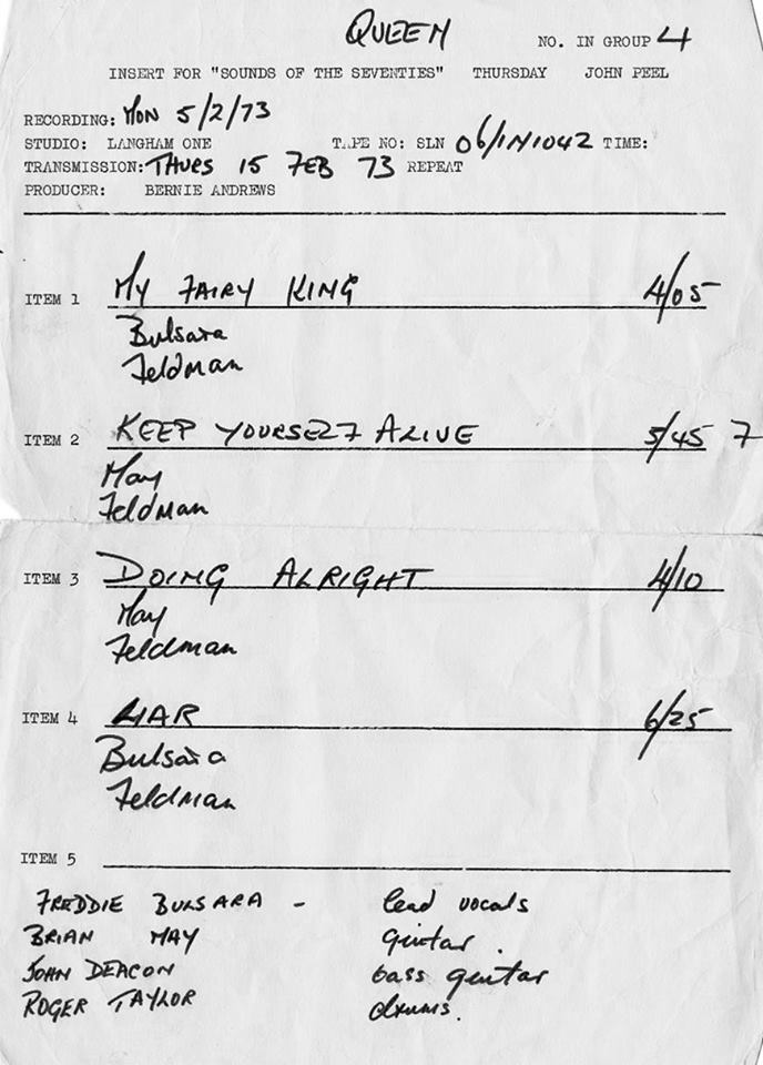Seen above is the band's first advertisement as Queen, done by Roger Taylor. Their second show was played to about fifty people, during which the band announced to the small crowd that Tim Staffell had left the band and that Freddie Mercury (who now no longer goes by the name Freddie Bulsara) is their new frontman. After a stint of reading Roman mythology around this time, he would change his last name to Mercury, meaning "messenger of the gods." However, when he made the change legally is another matter. This cue sheet from Queen's first BBC session reveals him still using his birth name in 1973. Brian May later reflected on this show: "The first proper gig we did was at Imperial College in the Union Hall. I remember it very distinctly because I'd seen all sorts of people playing in there. I'd been part of the Entertainment Committee [as a student] and we booked a group every Saturday night in those days. People like Spooky Tooth and Steamhammer! We booked Jimi Hendrix too. So for us it was a dream come true to actually play on that stage. It used to get packed in there, so it was a major stepping stone for us." Roger Taylor added: "Imperial College was effectively our positional and spiritual base and so means a lot to Queen. Many good memories, without it... who knows?" The photos seen above (picturing Freddie and original bassist Mike Grose) are the earliest known pictures from a Queen show. They were taken by Doug Puddifoot, who took all of the known pictures of the band during this period. The black image of Queen that stuck with them through 1976 (particularly on the cover of Queen II and later in the groundbreaking Bohemian Rhapsody video) was born right at the beginning of their existence. Doug also filmed the only known video footage of Smile (at the Royal Albert Hall in London, 1969) and later designed Queen's debut album cover using photos he took at a party in June 1971. |