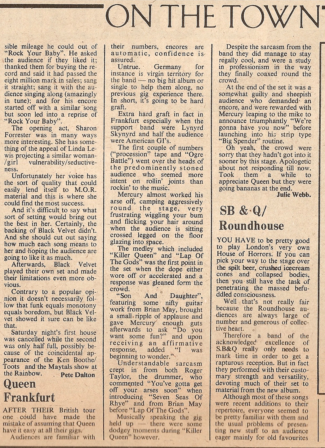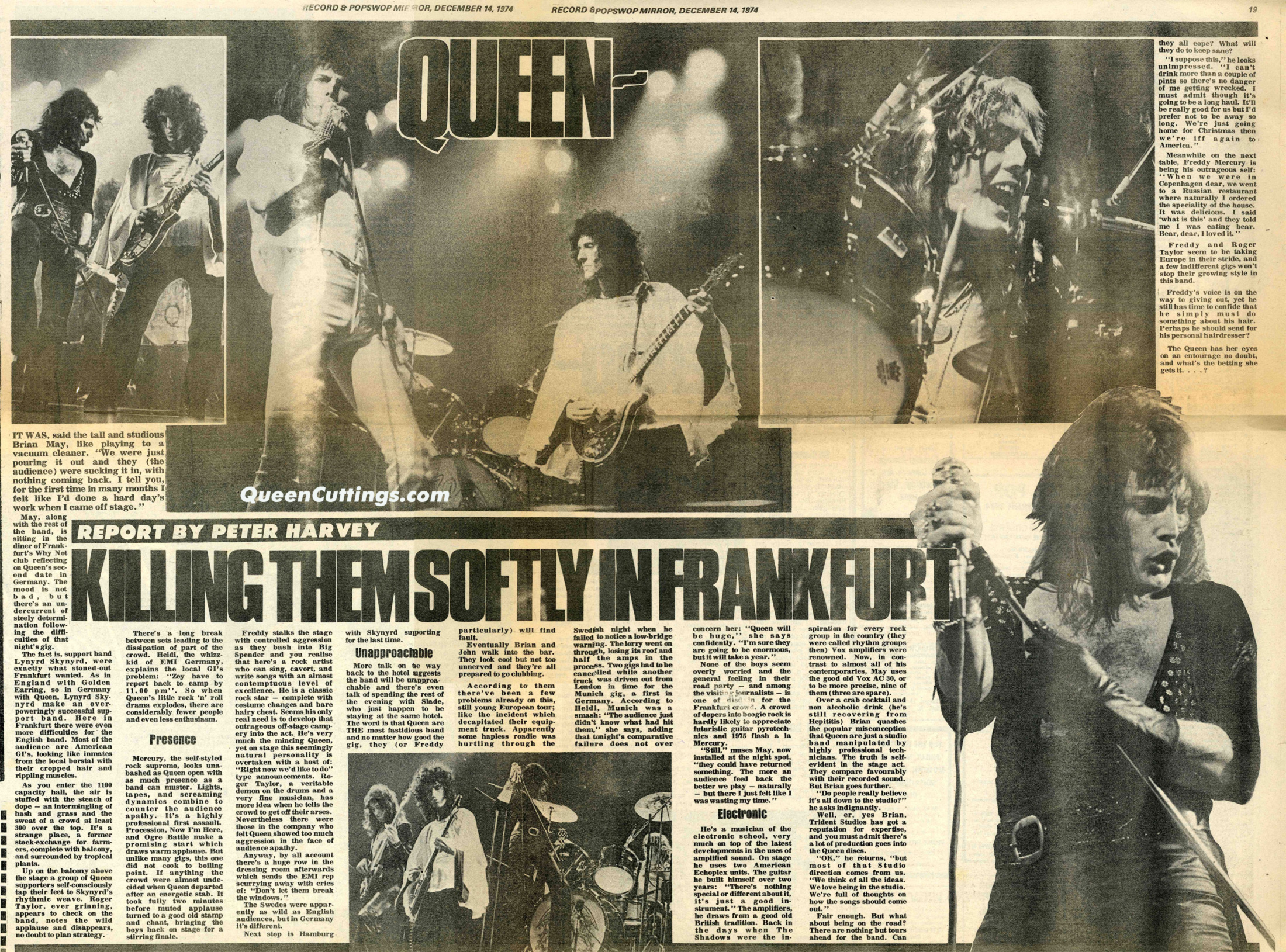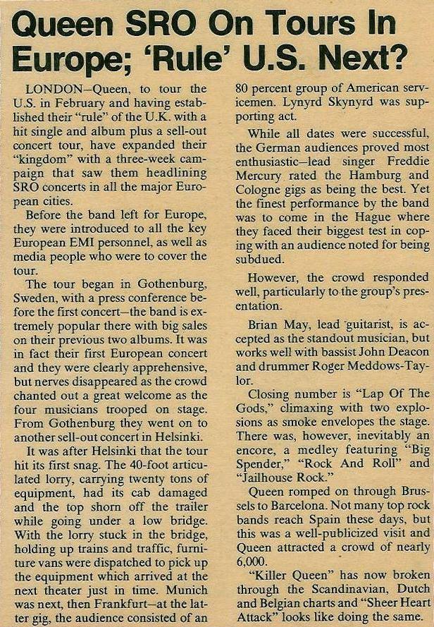 Lynyrd Skynyrd opened for Queen at this show, and the audience, consisting largely of American GIs, liked the opening band far more than the main act. In fact, plenty of people left after Skynyrd finished their set. Brian May's reaction after the gig: "We were just pouring it out and they were sucking it in, with nothing coming back. I tell you, for the first time in many months I felt like I'd done a hard day's work when I came off stage." However, the second of these two reviews says the crowd warmed up to Queen by the end of the show: (1, 2) Roger, in his typical outspoken manner, later recalled the experience of having Skynyrd open for them: "They were awful. They were Southern rednecks and they could not believe it when they saw us four caked in make-up and dressed like women. They were outraged, confused, and a little frightened, because the four nancy boys were giving them quite a run for their money on-stage. God, Lynyrd Skynyrd! They were arseholes, frankly. When they played that song 'Free Bird' it seemed to go on for months. As I remember they had three lead guitarists. Hmmm, well we only seemed to need one. Absolute arseholes. Later on they had that terrible fatal plane crash, didn't they? Shouldn't speak ill of the dead... bollocks to that!" Many thanks to Rob Schoorl for an article from Billboard magazine mentioning this show amongst others on the tour. |