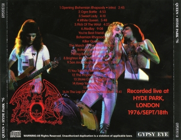 | Track listing: | A Day At The Races overture, Bohemian Rhapsody (tape & rock part), Ogre Battle, Sweet Lady, White Queen, Flick Of The Wrist, You're My Best Friend, Bohemian Rhapsody (verses), Killer Queen, The March Of The Black Queen, Bohemian Rhapsody (reprise), Bring Back That Leroy Brown, Brighton Rock, Son And Daughter, '39, You Take My Breath Away, The Prophet's Song, Stone Cold Crazy [cut], Keep Yourself Alive, Liar, In The Lap Of The Gods...Revisited | |