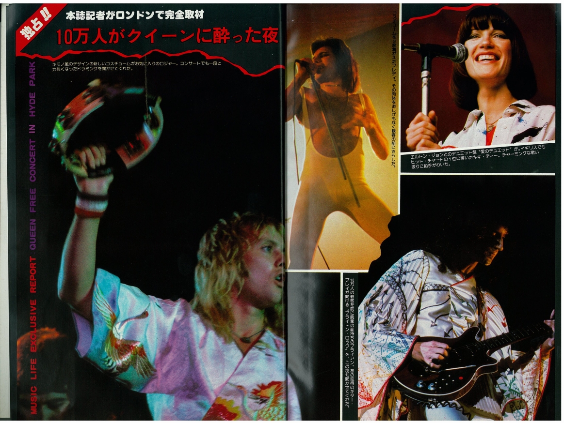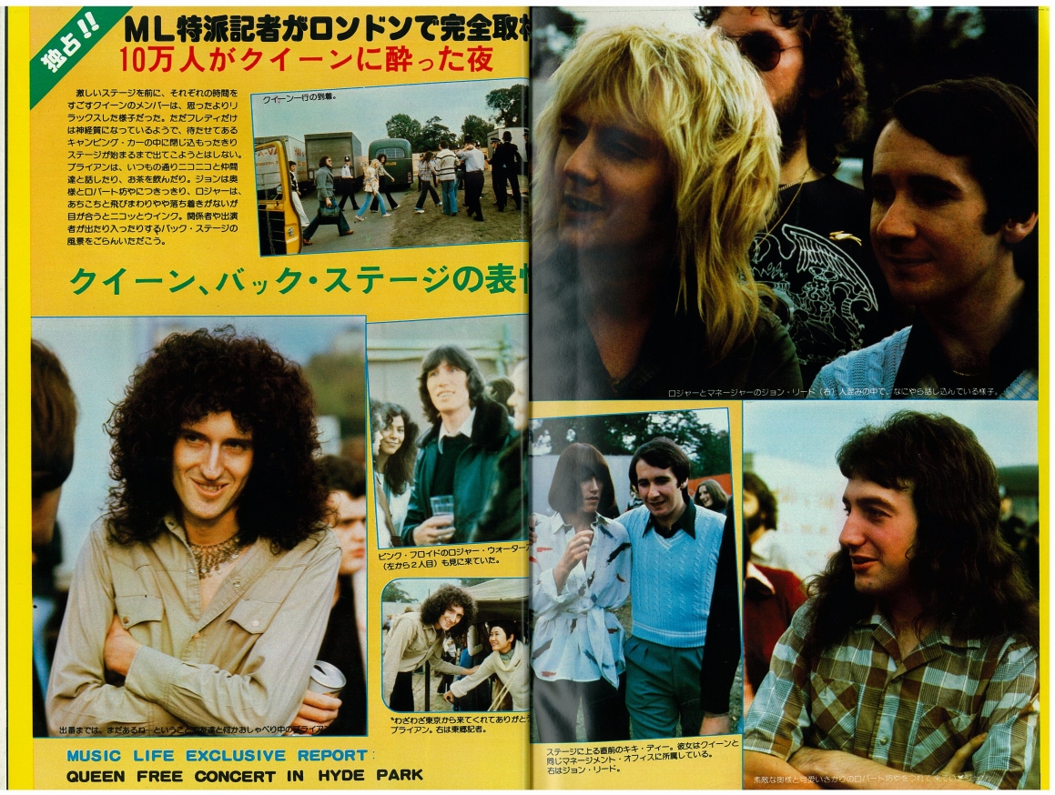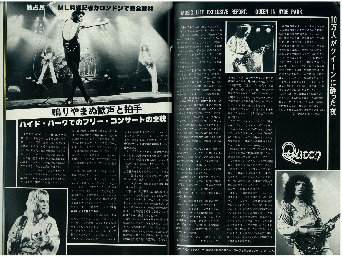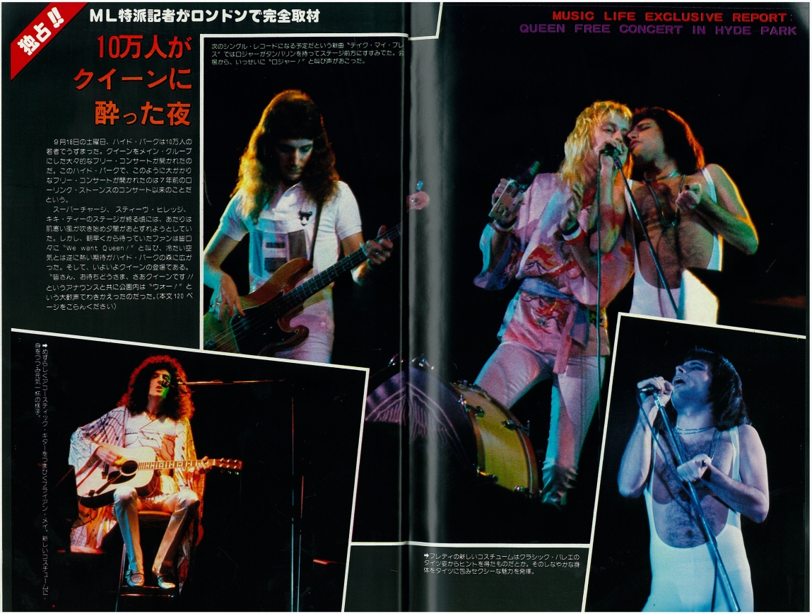 In a 1977 interview with Capital Radio, Brian recalls the day: "It had a great sunny day for it, and everyone had a good time. There were still altercations on the day, and there was a big thing with the powers that be because they wouldn't let us go on and do the encore, about which we were very upset, having worked up for months and prepared for all that. They got very frightened because there were 150,000 people in Hyde Park in the dark, and they thought they were going to get out of hand. But in fact, there was no possible danger happening at all. Everyone was peaceful and having a good time." This show is what epitomized their popularity in Britain, and when they felt they "had really made it," as Brian would later recall. On another occasion he said, "I think that Hyde Park was one of the most significant gigs in our career. There was a great affection because we'd kind of made it in a lot of countries by that time, but England was still, you know, we weren't really sure if we were really acceptable here. So it was a wonderful feeling to come back and see that crowd and get that response." Despite the fact that the audience had been there all day watching the various opening acts and waiting, the band delayed the show as long as possible just so it could get dark enough for their lighting and various other effects to make their full impact (as demanded by Freddie). Throughout the show the band's nervousness and excitement for the occasion are evident. Most of the audience couldn't see a thing during Queen's set, since the stage was barely elevated. "The smell of the dry ice and the sound are the only sensory memories I have of this show," recalls Jane Palm-Gold. Here is an article from the day of the show, and a review from a week later (both were submitted by Boris Arkhangelsky). This show was recorded by Capital Radio but never broadcast (although some claim to have heard it). A Capital Radio transcription disc allegedly exists, according to this article from the June 1989 issue of Record Collector. In the autumn '76 fan club magazine Roger Taylor wrote, "There should be a film of the Hyde Park show on TV soon," but it was never shown in its entirety. Only one song, Sweet Lady, was shown on British TV (the Old Grey Whistle Test) on December 14, along with an interview with Brian May by Bob Harris. This superb (and perhaps definitive) performance of the song was also broadcast on US TV, on Don Kirshner's "Rock Concert" on February 8, 1977 (along with the promo video of Somebody To Love, which also contained some Hyde Park footage). Some of Sweet Lady was also shown on a 1979 US TV documentary called "The Champions" (the tape noticeably played a bit slowly). It was eventually included on the A Night At The Opera 30th anniversary DVD, along with clips of Bohemian Rhapsody and The Prophet's Song. The complete pro-shot video (notably an entirely different source from the BBC footage) eventually leaked to collectors. It has also been shown at fan conventions, and clips (usually of Flick Of The Wrist, '39 or Keep Yourself Alive) have shown up in many documentaries, particularly "The Magic Years" released on VHS in 1987, and the 1995 "Champions Of The World" VHS. In 2001, Jacky Smith, the head of the Queen fan club, said, "The quality is very very bad and they cannot 'rescue' it as it was filmed on 16mm and not stored properly." While the segments from the aforementioned DVD are in excellent quality, this doesn't necessarily mean all the footage has survived. And it should be noted that the footage was shot on video and stored on 16mm film. In March 2009, BBC radio 2 broadcast an informative program called "Wish You Were There," including interviews with Bob Harris and Peter "Ratty" Hince (one of Queen's roadies), as well as people who attended the show. Queen's set as well as the opening acts were among the things discussed about the ground-breaking concert. Parts of the first couple songs of the show were shown at the "Stormtroopers in Stilettoes" Queen exhibition in London in early 2011, in better audio (although mono) and video quality than ever before. Clips of the songs were also seen in the 2011 documentary "Days Of Our Lives" aired on BBC Two. The Bohemian Rhapsody clip was notably of Freddie's first line ("So you think you can stone me and spit in my eye"), a line in which Freddie is mute due to technical/audio issues on the average quality pro shot footage video mentioned above. Perhaps this inclusion was no accident. The Hyde Park version of You Take My Breath Away was released as a bonus track on the 2011 remaster of A Day At The Races. Part of You're My Best Friend was seen in a 2015 BBC documentary called "From Rags To Rhapsody." As with most recent broadcasts of the Hyde Park material, both the audio and video quality are excellent (there have been a few slight fixes and overdubs on this material in the various releases and documentaries - see Chinwonder's video analysis for details). The thirteenth pic is the famous overhead shot that appeared in the October 9, 1976 Melody Maker. Pics 3 and 16 were submitted by Janneman, and pics 17 and 18 were submitted by Lukáš Bosík. Pics 20 and 21 were taken by Hiro Ohno. The last set was taken by Ian Loveday. Here you can buy some prints of pictures taken by Alan David Perry: http://www.concertphotos.uk.com Here are a few more pro pics: 1 2 3 And a Virgin Records flyer. The November 1976 issue of the Japanese "Music Life" magazine contained an article and pictures from the show (many thanks to Masahiko for the scans): 1 2 3 4 5 6 7 8 9 10 11 |