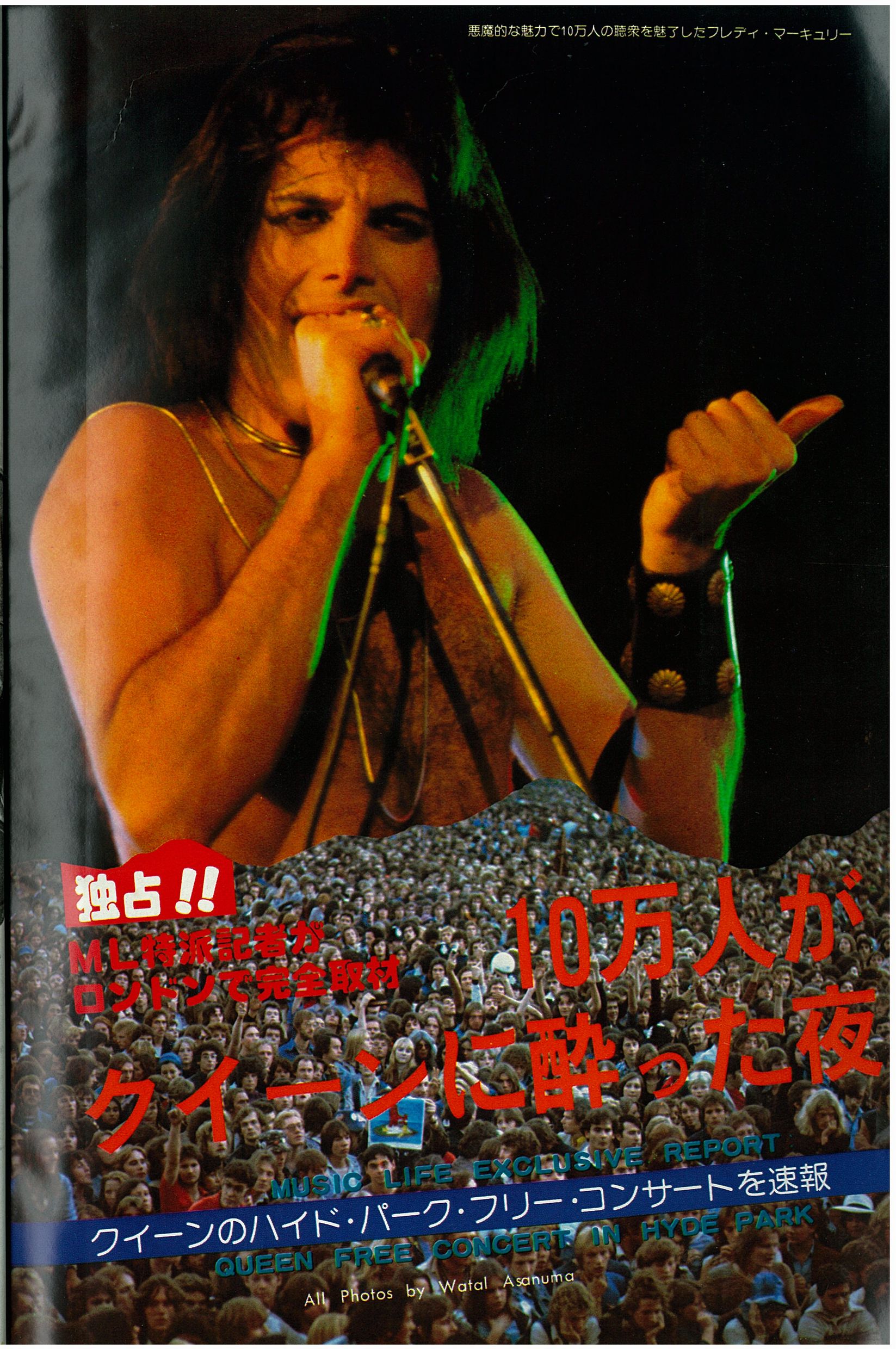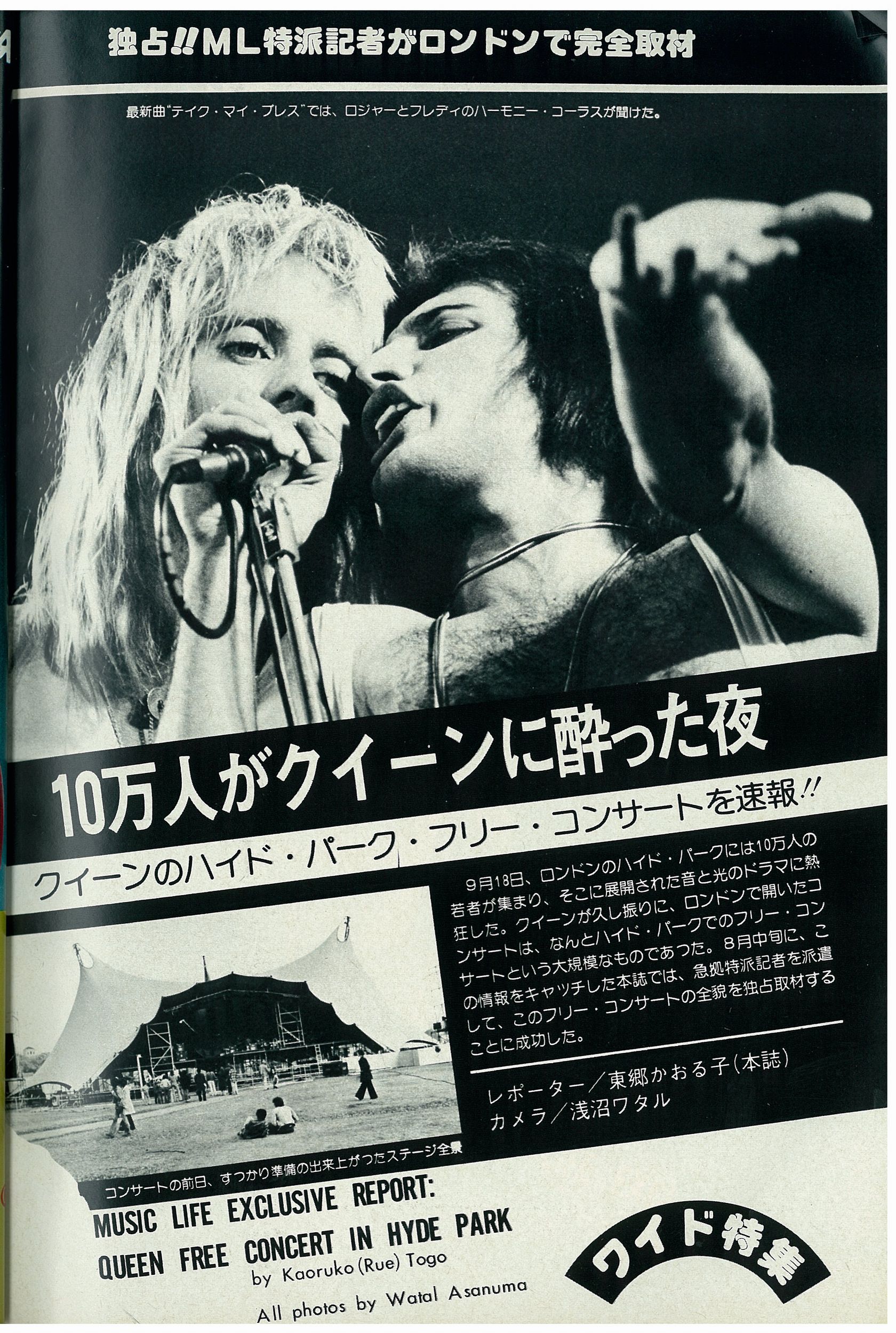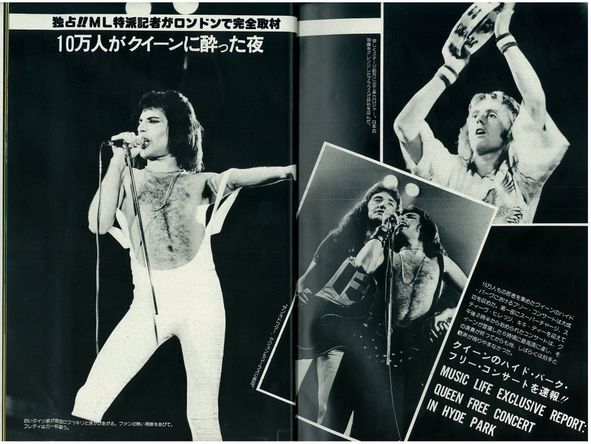 In a 1977 interview with Capital Radio, Brian recalls the day: "It had a great sunny day for it, and everyone had a good time. There were still altercations on the day, and there was a big thing with the powers that be because they wouldn't let us go on and do the encore, about which we were very upset, having worked up for months and prepared for all that. They got very frightened because there were 150,000 people in Hyde Park in the dark, and they thought they were going to get out of hand. But in fact, there was no possible danger happening at all. Everyone was peaceful and having a good time." This show is what epitomized their popularity in Britain, and when they felt they "had really made it," as Brian would later recall. On another occasion he said, "I think that Hyde Park was one of the most significant gigs in our career. There was a great affection because we'd kind of made it in a lot of countries by that time, but England was still, you know, we weren't really sure if we were really acceptable here. So it was a wonderful feeling to come back and see that crowd and get that response." Despite the fact that the audience had been there all day watching the various opening acts and waiting, the band delayed the show as long as possible just so it could get dark enough for their lighting and various other effects to make their full impact (as demanded by Freddie). Throughout the show the band's nervousness and excitement for the occasion are evident. Most of the audience couldn't see a thing during Queen's set, since the stage was barely elevated. "The smell of the dry ice and the sound are the only sensory memories I have of this show," recalls Jane Palm-Gold. Here is an article from the day of the show, and a review from a week later (both were submitted by Boris Arkhangelsky). This show was recorded by Capital Radio but never broadcast (although some claim to have heard it). A Capital Radio transcription disc allegedly exists, according to this article from the June 1989 issue of Record Collector. In the autumn '76 fan club magazine Roger Taylor wrote, "There should be a film of the Hyde Park show on TV soon," but it was never shown in its entirety. Only one song, Sweet Lady, was shown on British TV (the Old Grey Whistle Test) on December 14, along with an interview with Brian May by Bob Harris. This superb (and perhaps definitive) performance of the song was also broadcast on US TV, on Don Kirshner's "Rock Concert" on February 8, 1977 (along with the promo video of Somebody To Love, which also contained some Hyde Park footage). Some of Sweet Lady was also shown on a 1979 US TV documentary called "The Champions" (the tape noticeably played a bit slowly). It was eventually included on the A Night At The Opera 30th anniversary DVD, along with clips of Bohemian Rhapsody and The Prophet's Song. The complete pro-shot video (notably an entirely different source from the BBC footage) eventually leaked to collectors. It has also been shown at fan conventions, and clips (usually of Flick Of The Wrist, '39 or Keep Yourself Alive) have shown up in many documentaries, particularly "The Magic Years" released on VHS in 1987, and the 1995 "Champions Of The World" VHS. In 2001, Jacky Smith, the head of the Queen fan club, said, "The quality is very very bad and they cannot 'rescue' it as it was filmed on 16mm and not stored properly." While the segments from the aforementioned DVD are in excellent quality, this doesn't necessarily mean all the footage has survived. And it should be noted that the footage was shot on video and stored on 16mm film. In March 2009, BBC radio 2 broadcast an informative program called "Wish You Were There," including interviews with Bob Harris and Peter "Ratty" Hince (one of Queen's roadies), as well as people who attended the show. Queen's set as well as the opening acts were among the things discussed about the ground-breaking concert. Parts of the first couple songs of the show were shown at the "Stormtroopers in Stilettoes" Queen exhibition in London in early 2011, in better audio (although mono) and video quality than ever before. Clips of the songs were also seen in the 2011 documentary "Days Of Our Lives" aired on BBC Two. The Bohemian Rhapsody clip was notably of Freddie's first line ("So you think you can stone me and spit in my eye"), a line in which Freddie is mute due to technical/audio issues on the average quality pro shot footage video mentioned above. Perhaps this inclusion was no accident. The Hyde Park version of You Take My Breath Away was released as a bonus track on the 2011 remaster of A Day At The Races. Part of You're My Best Friend was seen in a 2015 BBC documentary called "From Rags To Rhapsody." As with most recent broadcasts of the Hyde Park material, both the audio and video quality are excellent (there have been a few slight fixes and overdubs on this material in the various releases and documentaries - see Chinwonder's video analysis for details). The thirteenth pic is the famous overhead shot that appeared in the October 9, 1976 Melody Maker. Pics 3 and 16 were submitted by Janneman, and pics 17 and 18 were submitted by Lukáš Bosík. Pics 20 and 21 were taken by Hiro Ohno. The last set was taken by Ian Loveday. Here you can buy some prints of pictures taken by Alan David Perry: http://www.concertphotos.uk.com Here are a few more pro pics: 1 2 3 And a Virgin Records flyer. The November 1976 issue of the Japanese "Music Life" magazine contained an article and pictures from the show (many thanks to Masahiko for the scans): 1 2 3 4 5 6 7 8 9 10 11 |