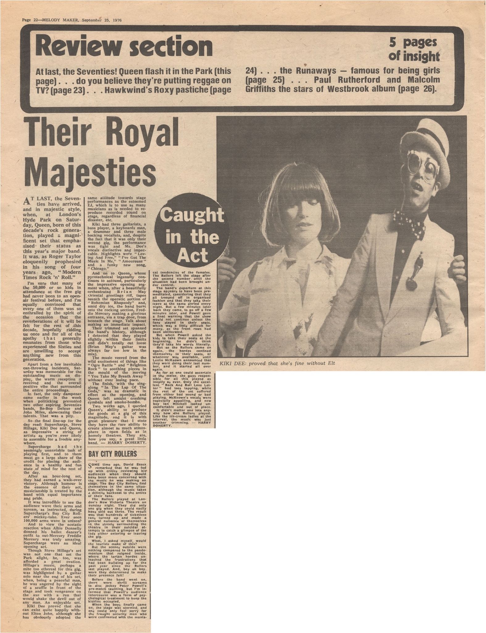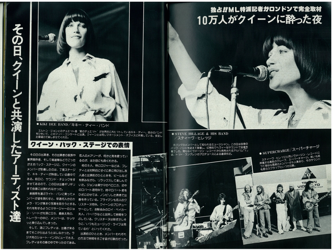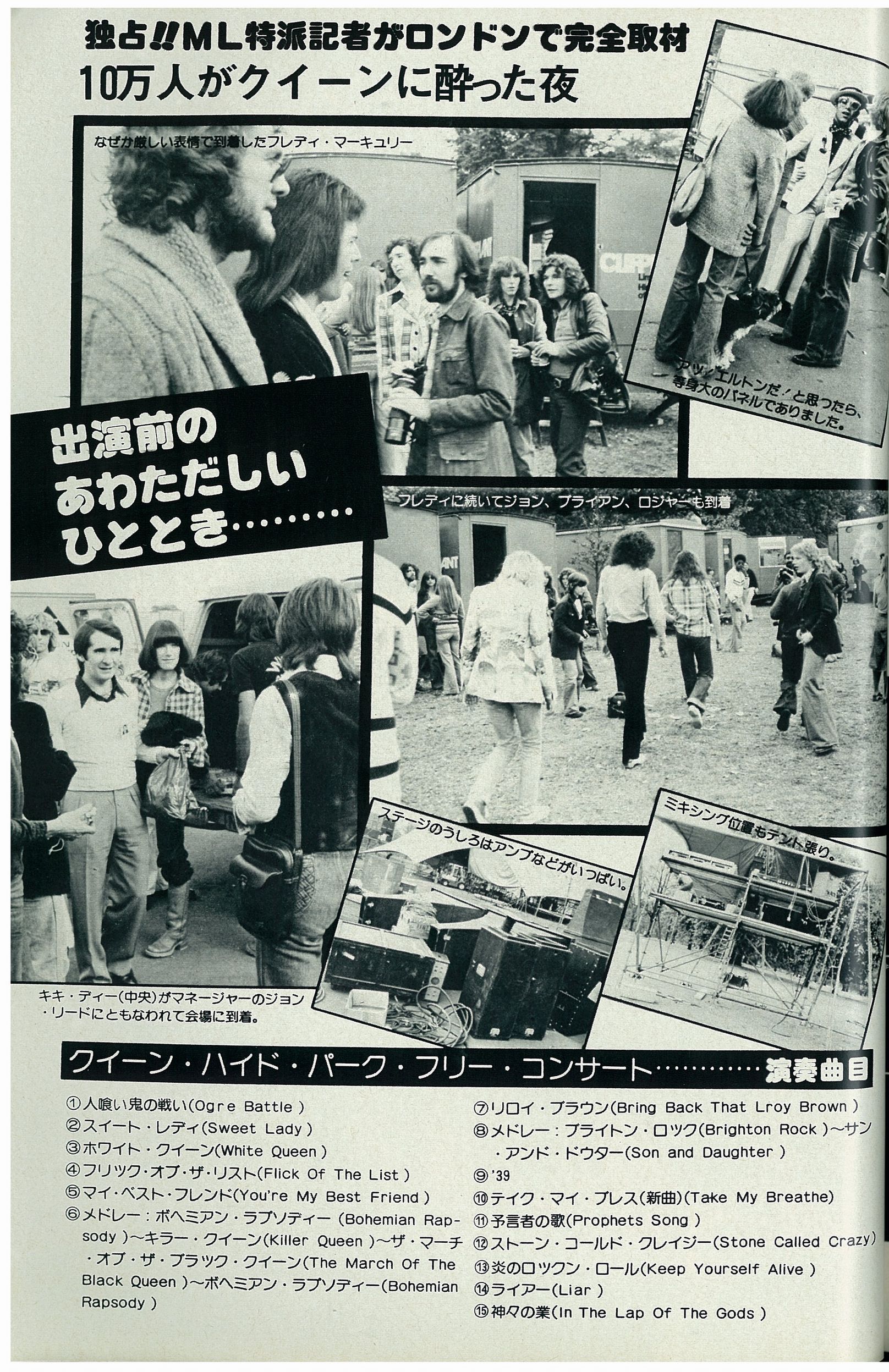 After the success of A Night At The Opera (and not to mention how the weekly Sounds readers' poll elected the band #1 in the best album, best single, and best band categories), Queen wanted to pay the British fans back for back their loyalty and support over the last few years. Whilst in Japan earlier in the year, they came up with the idea to stage a massive free concert. With the help of record industry entrepreneur Richard Branson (creator of Virgin Records/megastores) they started making plans for the Hyde Park show, which turned into a mini tour along with the Edinburgh and Cardiff shows. It is estimated that between 150-200 thousand people turned up at Hyde Park, which is still a record for the venue to this day. This show cemented their position in the top bracket of rock bands. The stage used was the same stage that was constructed for the Rolling Stones concert at the Knebworth Fair a few weeks earlier. Queen's first huge show at home brought certain areas of London to a grinding halt, and space on public transportation was at a premium. The concert took place on the anniversary of Jimi Hendrix's death. A banner hung from a tree that read "Hendrix Lives," and at one point in the show Brian May noticed it with much appreciation. The band are seen in the photos above arriving at the venue, where they were joined backstage by Pink Floyd's Roger Waters. Supercharge, Steve Hillage, Rufus, and Kiki Dee (along with a cardboard cut-out of Elton John, who couldn't make it to join her for Don't Go Breaking My Heart) played before Queen (Be-Bop Deluxe and John Miles were supposed to be on the bill as well, but were axed for some reason). A pro-shot video of Steve Hillage's performance exists as well as Queen's. There was a fight in the audience during Hillage's set, during which he played extended trippy versions of It's All Too Much by The Beatles and Hurdy Gurdy Man by Donovan. Also notable is Supercharge's singer Albie Donnelly parodying Freddie Mercury in a white leotard and a half mic stand. The first half of the A Day At The Races overture is aired publicly for the first time (the upcoming album had been partially recorded by this point). The usual Bohemian Rhapsody opening sequence then commences for the last time. The band make their entrance, and everybody near the stage stands up (the audience had been seated on the grass for the opening acts). This angers many fans who are further back (roughly 90% of the audience now cannot see the stage), so they start lobbing cans, bottles, or whatever else that can be thrown. After a few songs, Freddie asks everyone simply to calm down: "I have been requested by the constabulary for you not to throw little things around, tin cans or whatever. So make this a peaceful event, ok? Sit on your arses and listen." Brian, after his solo spot in Brighton Rock (he stutters a bit, revealing that he's still nervous): “From one piece of nonsense to another, I’ve said it before. This is something we wanted to do with the London Philharmonic but they didn’t show up, so we will do the ethnic version of a song called '39." He is seen in a dazzling new outfit tonight, which he'd wear every night through Japan 1979. It would become the outfit he'd change into during the opera section of Bohemian Rhapsody. "Clap along and stuff," he urges the audience, as he plays the intro of what he'd later describe as the first song about Einstein's general theory of relativity. After '39, Freddie audaciously performs the as-of-yet unreleased You Take My Breath Away alone on the piano, even hitting many of the falsetto notes that he'd excise in 1977 versions. He then gets cheeky and introduces The Prophet's Song as "a little shorter number from our album A Night At The Opera." Perhaps he still had You Take My Breath Away in his head, as he begins the a cappella section with what would become the first line of the A Day At The Races ballad instead of the usual "oh, people can you hear me?" bit. He also references Death On Two Legs, as he had done a few times earlier in the year. After Stone Cold Crazy, the band play Keep Yourself Alive and Liar, having dropped Doing All Right and Lazing On A Sunday Afternoon from the set. The combination of these three heavy numbers would prove to be very effective, and they would stick with it for their following North American tour. Liar is a great version, with many great Mercuryisms throughout. Before the last song, Brian coyly says, "This is In The Lap Of The Gods, or something like that." The band play a similar set to the ones they did in Edinburgh and Cardiff, except they drop Doing All Right, Lazing On A Sunday Afternoon and Tie Your Mother Down. They intended to perform their usual encore of Big Spender and Jailhouse Rock, but the show had run a half hour past its scheduled ending time (a curfew strictly enforced by the authorities). The police threatened to arrest the band if they went back on stage, and Freddie was later quoted saying how he would prefer not to be stuck in a jail cell in his leotard. And so, Bob Harris was left with the unenviable task of announcing to the crowd that the show was over. He later recalled how difficult and nerve-wracking it was to tell an audience of this size who had waited for about ten hours that there would be no encore. Now I'm Here was the first encore every night around this time, making this the one time between 1974 and 1986 where the song is not performed. The liner notes of Live Killers suggest that Now I'm Here was dropped from the set for a while, but that is patently untrue. Tonight would see the final performances of Flick Of The Wrist, Son And Daughter, and the (almost) full The Prophet's Song. A snippet of The March Of The Black Queen would be performed only once more in 1978, but it was a different part of the song. People in one section of the audience chanted "Why are we waiting," all in good fun, knowing full well the show was over. The police soon turned off the main powe