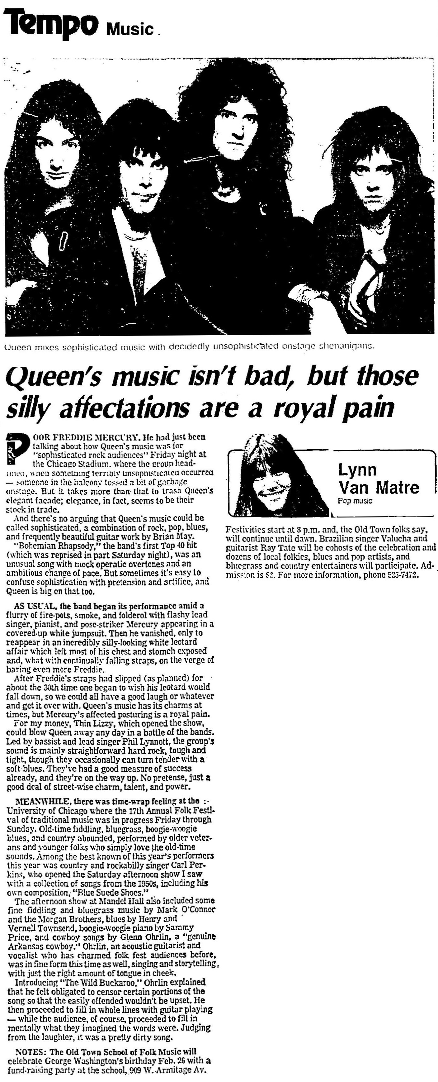 Due to bad weather, the trucks with all of Queen's gear were delayed in getting from Montreal to Chicago. One truck blew off the road, and another P.A. system had to be flown in for this show. The thousands of freezing fans were waiting outside in the bitter cold, and the promoter told Freddie that the fans were turning blue, pleading with him to have the stadium doors opened. Freddie simply stated, "Darling, we haven't had a soundcheck yet. We can't possibly let them hear Queen until then." But it seemed to Thin Lizzy's manager Chris O'Donnell that Freddie deliberately delayed the whole process just to make his point. He recalls: A lemon was thrown at Scott Gorham during Lizzy's set. A few songs into Queen's set (during The Millionaire Waltz), about a dozen eggs were thrown from the balcony onto the stage, and Brian May slipped and hurt his tailbone. Freddie stopped the show, the band walked off, and the house lights came back on. They regrouped backstage, and ultimately decided to continue playing. Otherwise the "bad guys would win," as Brian would later recall. Fifteen minutes later the show resumed, with Freddie saying something to the effect of, "Listen you motherfuckers, we don't have to play for you if we don't want to. But for the other 99% of you who want to see the show, we will continue." Gorham later joked about it: "There's a guy somewhere in there with a whole salad bar just waiting for us. We may not be getting paid much, but hell we'll sure eat well!" Now I'm Here ended up being the only encore, probably because Brian was hurting. Here's a review from the January 31 Chicago Tribune, submitted by Victoria Dobbs. An incomplete audience recording of Thin Lizzy's opening set emerged in 2010. |