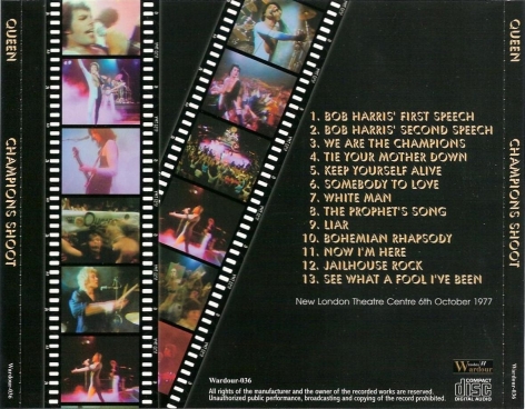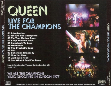 | Track listing: | Introduction speech, We Are The Champions initial playing [cut], many speeches and We Are The Champions (video shoots 1, 2, and 4), Tie Your Mother Down, Keep Yourself Alive, Somebody To Love, White Man, The Prophet's Song, Liar, Bohemian Rhapsody (verses), Now I'm Here, Jailhouse Rock, See What A Fool I've Been |