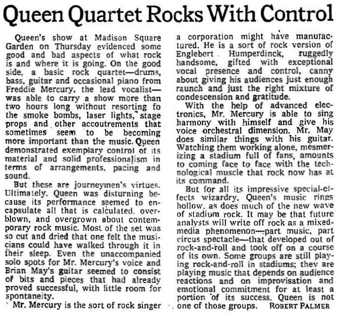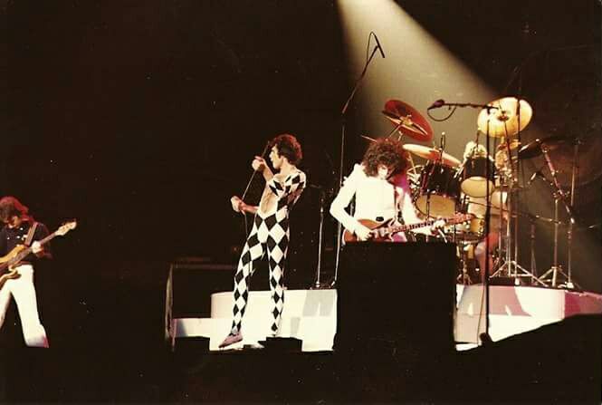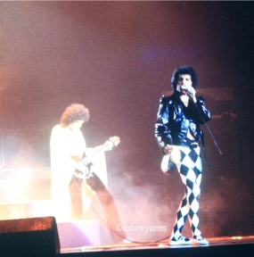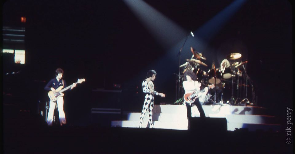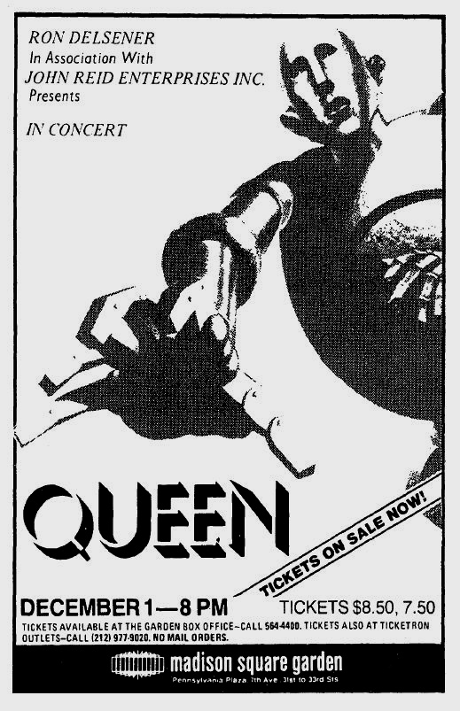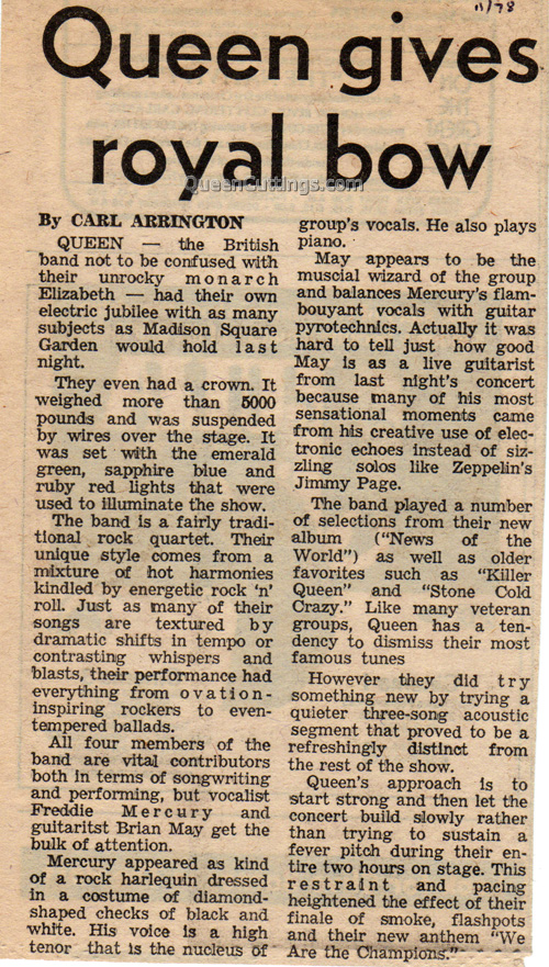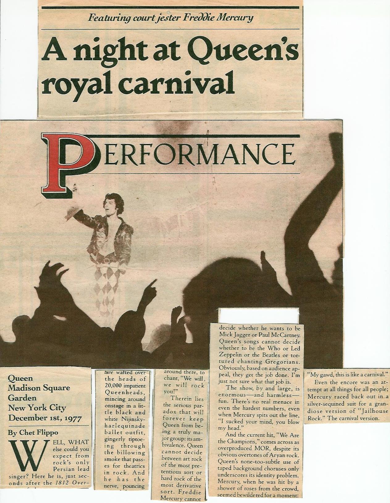 After the first song Freddie greets the audience: "Good evening, wonderful New York! How are you feeling tonight, you rock and rollers? Are you ready to rock with us?" He is then pummeled with roses from a few audience members after Somebody To Love, prompting him to exclaim, "It's like a carnival!" "There's our latest shirts over there." Brian gets distracted for a brief moment before Love Of My Life, just as Robert Plant was a couple years prior at the same venue between songs. He continues, "We're gonna take some time off and try something a little different. We haven't done this before for you. This requires a lot of peace and quiet, and a little bit of concentration." Someone in the audience picks this 'appropriate' time to set off a few firecrackers, as was not unusual at concerts the 70s. Freddie and Brian still haven't completely worked out the new arrangement of the song. During the intro, Brian has to change keys, and he remarks, "That's better," before Freddie begins to sing the lovely ballad. Freddie, before My Melancholy Blues: "Right, we have three songs in the sort of acoustic set. This is the third one, and I think I'd like to dedicate this to Ella Fitzgerald. She's here tonight." Brian May plays a bit of Deck The Halls in his solo spot, and soon afterward he breaks a string and struggles with his tuning with the whammy bar for a minute until Freddie comes on to transition back into The Prophet's Song. Brian then swaps guitars and carefully detunes the Birch copy to drop D as they continue the song as normally as they can. To buy some time Freddie holds out the mic to a few audience members in the front row who shout nonsense into it for a brief moment as his guitarist sorts out the problem in front of 20,000 others. Mercury comes on for the first encore of We Will Rock You and We Are The Champions in a New York Yankees jersey and cap, as the Yankees had just won the World Series in October. Deacon is seen with a Yankees cap as well. Here are four reviews of the show, from Rolling Stone, the New York Times, the Village Voice, and (probably) the New York Daily News. The third one is more of a personal attack on Freddie Mercury than a concert review. Thanks to Rob Schoorl for sharing these reviews, as they particularly helped identify which pictures come from which night. Pics 4 and 5 taken by Ed Rosenbaum and Steve Schechter respectively. Photo 15 is from the collection of Derek McCabe. The second photo set was submitted by Juan Guarino (and cleaned up by Rudolf Griva), and the remaining sets were taken by Jeff Goldsmith, Albert DeBow, Robert Miyares, Ed Hoffer and Rik Perry respectively. Some pro photos from this show ended up in the May 1978 issue of Rock Scene magazine. Here are a few more pro pics (1, 2, 3, 4). |