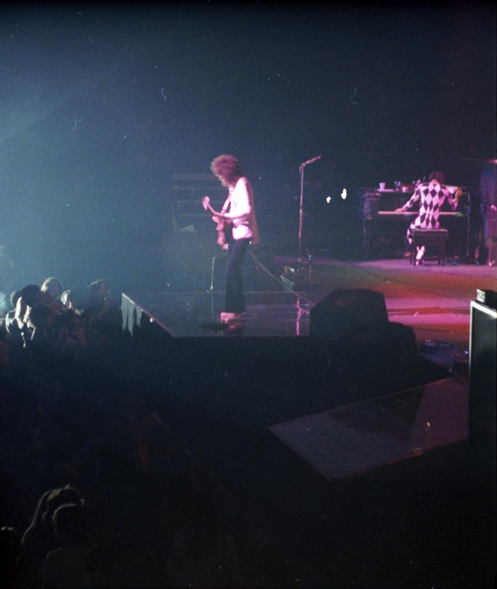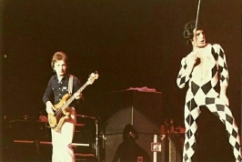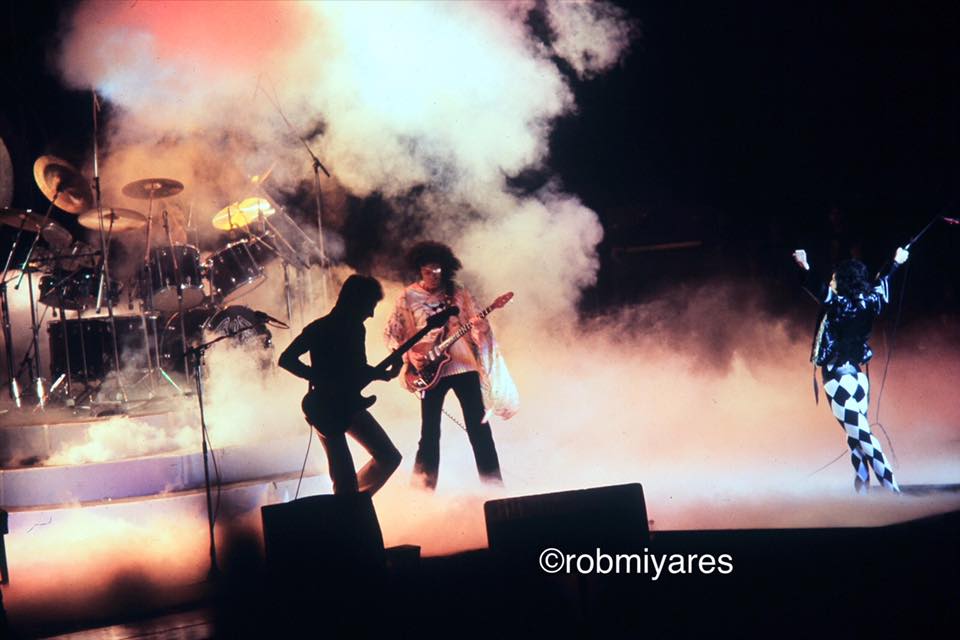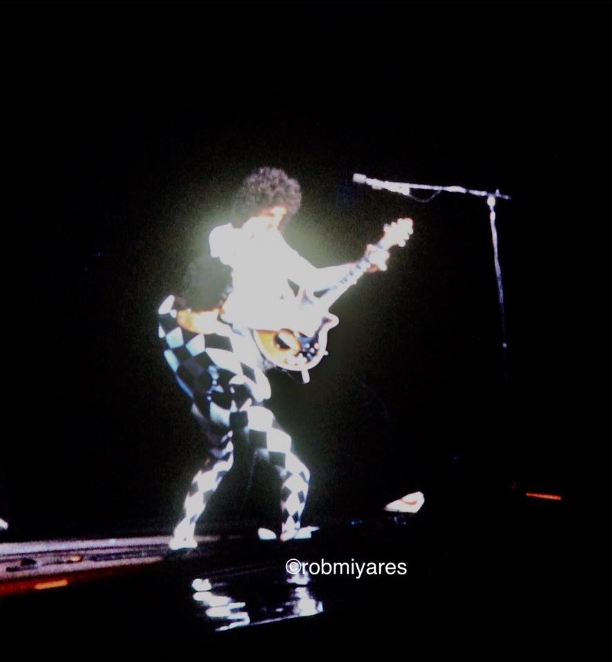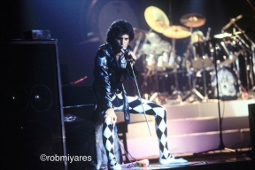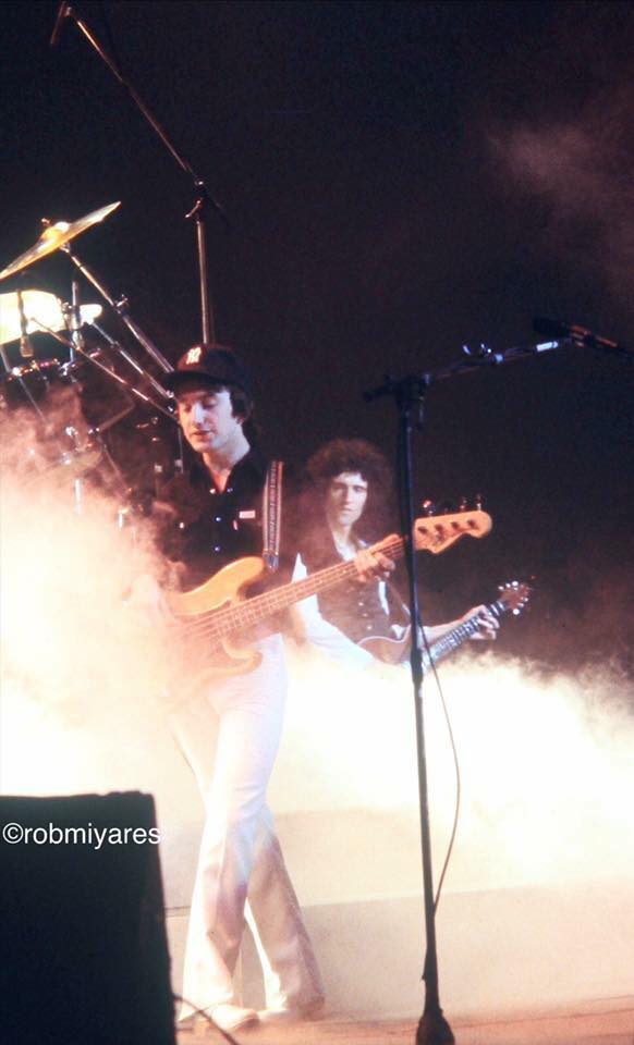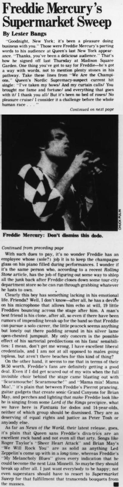 After the first song Freddie greets the audience: "Good evening, wonderful New York! How are you feeling tonight, you rock and rollers? Are you ready to rock with us?" He is then pummeled with roses from a few audience members after Somebody To Love, prompting him to exclaim, "It's like a carnival!" "There's our latest shirts over there." Brian gets distracted for a brief moment before Love Of My Life, just as Robert Plant was a couple years prior at the same venue between songs. He continues, "We're gonna take some time off and try something a little different. We haven't done this before for you. This requires a lot of peace and quiet, and a little bit of concentration." Someone in the audience picks this 'appropriate' time to set off a few firecrackers, as was not unusual at concerts the 70s. Freddie and Brian still haven't completely worked out the new arrangement of the song. During the intro, Brian has to change keys, and he remarks, "That's better," before Freddie begins to sing the lovely ballad. Freddie, before My Melancholy Blues: "Right, we have three songs in the sort of acoustic set. This is the third one, and I think I'd like to dedicate this to Ella Fitzgerald. She's here tonight." Brian May plays a bit of Deck The Halls in his solo spot, and soon afterward he breaks a string and struggles with his tuning with the whammy bar for a minute until Freddie comes on to transition back into The Prophet's Song. Brian then swaps guitars and carefully detunes the Birch copy to drop D as they continue the song as normally as they can. To buy some time Freddie holds out the mic to a few audience members in the front row who shout nonsense into it for a brief moment as his guitarist sorts out the problem in front of 20,000 others. Mercury comes on for the first encore of We Will Rock You and We Are The Champions in a New York Yankees jersey and cap, as the Yankees had just won the World Series in October. Deacon is seen with a Yankees cap as well. Here are four reviews of the show, from Rolling Stone, the New York Times, the Village Voice, and (probably) the New York Daily News. The third one is more of a personal attack on Freddie Mercury than a concert review. Thanks to Rob Schoorl for sharing these reviews, as they particularly helped identify which pictures come from which night. Pics 4 and 5 taken by Ed Rosenbaum and Steve Schechter respectively. Photo 15 is from the collection of Derek McCabe. The second photo set was submitted by Juan Guarino (and cleaned up by Rudolf Griva), and the remaining sets were taken by Jeff Goldsmith, Albert DeBow, Robert Miyares, Ed Hoffer and Rik Perry respectively. Some pro photos from this show ended up in the May 1978 issue of Rock Scene magazine. Here are a few more pro pics (1, 2, 3, 4). |