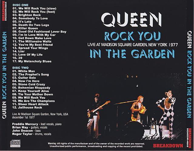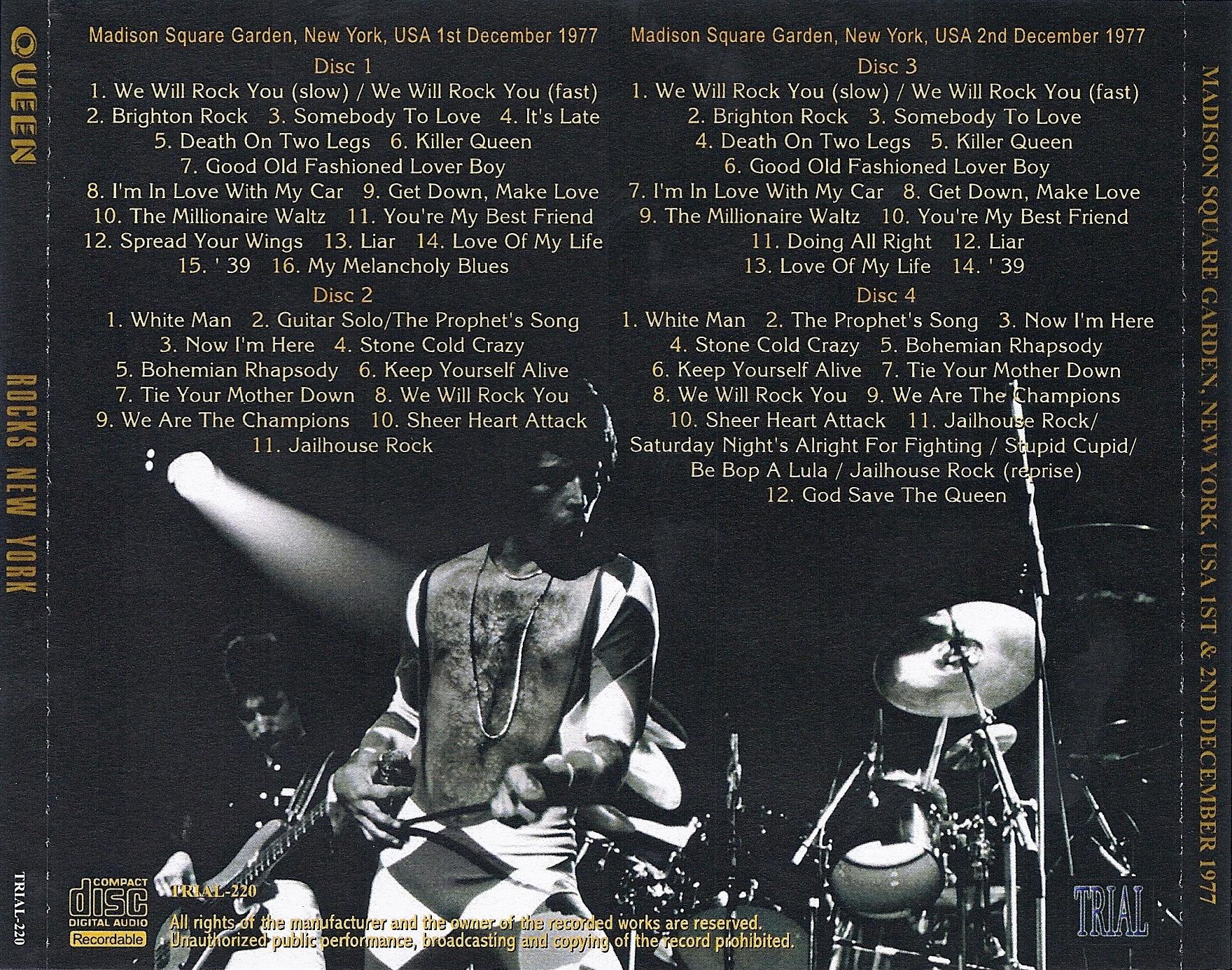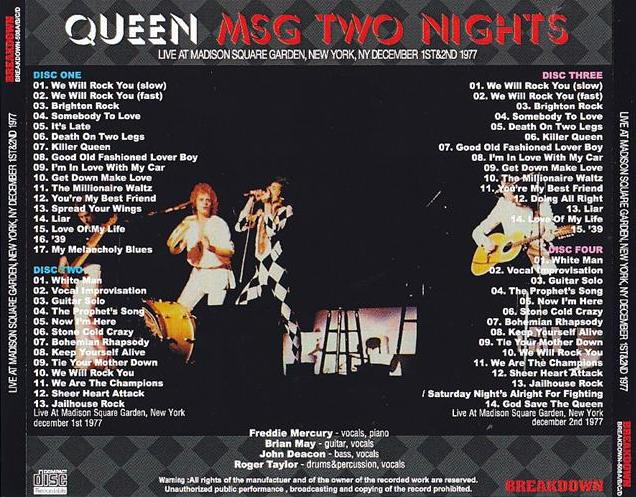 | Track listing: | We Will Rock You (slow/fast), Brighton Rock, Somebody To Love, It's Late, Death On Two Legs, Killer Queen, Good Old Fashioned Lover Boy, I'm In Love With My Car, Get Down Make Love, The Millionaire Waltz, You're My Best Friend, Spread Your Wings, Liar, Love Of My Life, '39, My Melancholy Blues, White Man, The Prophet's Song, guitar solo, The Prophet's Song (reprise), Now I'm Here, Stone Cold Crazy, Bohemian Rhapsody, Keep Yourself Alive, Tie Your Mother Down, We Will Rock You, We Are The Champions, Sheer Heart Attack, Jailhouse Rock [cut] |