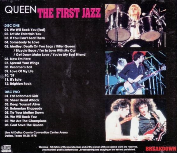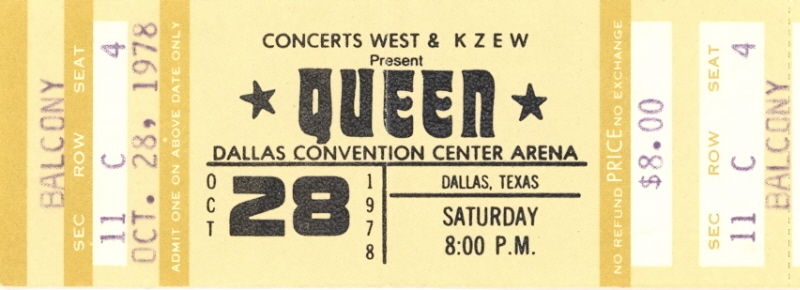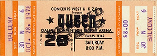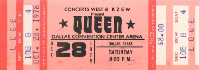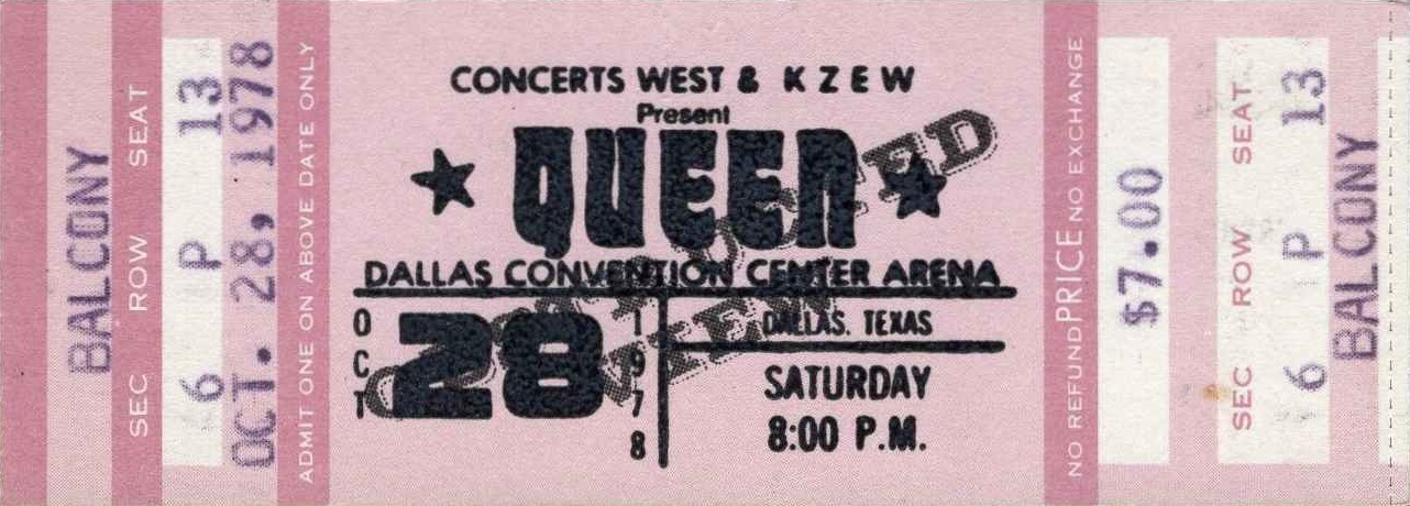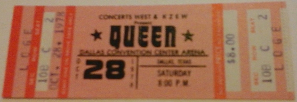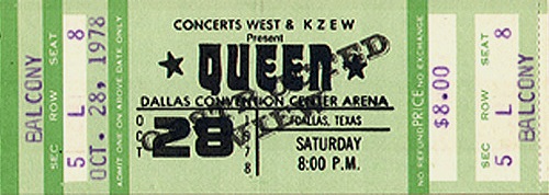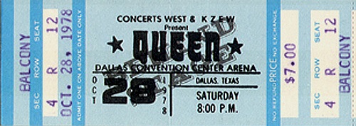 Before the concert, the promo video for their new single Fat Bottomed Girls (directed by Dennis De Vallance) is filmed. This is the first show of Queen's tour supporting their new album "Jazz" (although the LP isn't to be released for a couple weeks), and their stage show has once again changed dramatically. Their new lighting rig has rows of lights that are so warm underneath that it has earned the nickname "pizza oven." At the beginning and end of the show, when the lighting rig rises and descends respectively, the intense heat from all the lights is felt by audience members in the first few rows. Five new songs from the Jazz album are heard tonight. Let Me Entertain You, If You Can't Beat Them, and Dreamer's Ball are new to the audience, but Fat Bottomed Girls and Bicycle Race were released as a single a couple weeks earlier. Let Me Entertain You would be dropped after this show for a couple weeks. The Jazz tour finds the band in transition to becoming more of a pop-oriented band, not least because this is the first tour where no album tracks are resurrected from their back catalogue. There is a larger concentration of hit songs to the show than ever before, and this trend would continue with each passing tour. After the house lights go down, the show now opens with thunder being heard (as recorded by Brian May, and heard at the end of "Dead On Time" from the Jazz album), and Brian walking on stage first to play the opening chords of the fast version of We Will Rock You. This Dallas version of Let Me Entertain You is the closest to the record it would sound before it was developed into the blistering #2 live number. After the song, Freddie tells the audience that this is the first show of the American tour. "We have got a lot of new material for you, and you obviously are the first audience who are gonna listen to it. So anything might happen tonight, just about anything." Many older songs are dropped from the setlist to accomodate the newer material, but no other older songs are introduced or revived. For this first show, Let Me Entertain You and If You Can't Beat Them are performed successively, but soon Somebody To Love would be placed between them, as the band felt they should separate the new songs. Brian introduces Death On Two Legs after If You Can't Beat Them, but Freddie jumps in as there is a discrepancy with the setlist (perhaps even with the sound man as well, as Freddie's piano mic needs to be turned up a great deal after he starts speaking). "We're not gonna do that just yet. I'll kill you when I get in the dressing room!" he jokes to Brian. He continues, "We're gonna do a song... we're gonna do Death On Two Legs, don't worry, but before we do that, I'd like to do a song I like." This amuses the audience. "This is called Somebody To Love." The band sound a little rusty tonight at times, being the first show of the tour. They have some trouble getting into I'm In Love With My Car, and it takes an extra couple bars before they're back together again. Two songs are cut from the medley for this tour, and they add a portion of Bicycle Race to it. To queue the band out of the middle section of Get Down Make Love, Roger Taylor now blows a whistle from behind the drum kit. Freddie, after Now I'm Here: "A lot of people call this next song Spread Your Legs. It started off being called Spread Your Wings, but you can call it what you'd like." For the acoustic set on this tour, an additional smaller stage is lowered for the band to play on. A scaled-down 5-piece drum kit is there for Roger to play on Dreamer's Ball and '39. On this drum kit the News Of The World robot remains the bass drum head, but his main kit now sports the Jazz album logo. But for some reason, within a few shows he would revert back to the robot for the rest of the North American leg and ultimately switch back to the Jazz logo in Europe 1979. During the instrumental section of Dreamer's Ball, Brian and Roger play some vocal brass. During Brian's "trombone" solo, Freddie, clearly excited by this new addition to their show, says, "Listen to that!" Roger isn't doing his 'muted trumpet' part yet this early in the tour (although he would be by New York). On each side of the stage, there is a runway stretching out a few rows into the audience. It would be used for key points in the show, like the first verse of It's Late, which features only Freddie and Brian, each on his own runway. The smaller stage is raised back up to its original position at this point, adding to the drama and building to the next peak of the show. The opening night of the tour is only an hour and forty-five minutes long, but Now I'm Here and the Brighton Rock jam would get longer over time, bringing the show closer to two hours, and sometimes beyond. Tonight's compact version of Brighton Rock reveals the Brian/Roger/John jam in its infancy. This is the first concert where Roger would play the tympani. He plays it the same general spot of the show as he would for the next couple years, but it isn't a feature spot for him just yet this early in the tour. Clearly their philosophies about jamming on stage have evolved since Brian was quoted saying this in an interview five years earlier: "We keep numbers fairly short on stage. We're more into playing songs, as we did the whole jamming thing in the old band [Smile]. Jamming is great in a way, cause it gives you a great experience in playing with someone and playing what you're thinking all the time, but to watch a band do that you see it as self-indulgence." Roger plays the drum intro to Sheer Heart Attack in the wrong spot (did they not have a setlist written for the drummer?!). Freddie urges him to "cool it" and then introduces the debut concert performance of Fat Bottomed Girls. "You're a good audience, and you can take all the new numbers," he insists. "Would you like a new song?" They definitely would, judging by their positive response. The bulk of the song goes well, although the band barely ma