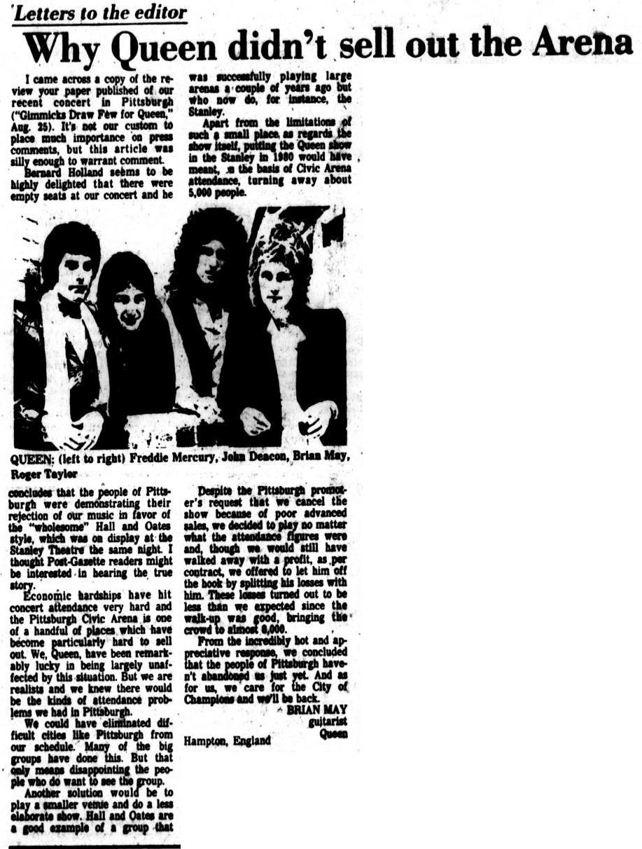Here is a review of this show at "The Igloo", which is more of a statement of the reviewer's disdain for the band. In an uncharacteristic move (Queen was no stranger to bad reviews and had grown a sense of resilience to it), Brian May felt the need to respond with a letter to the editor a couple weeks later to set the record straight. At the time Pittsburgh's main industry, steel production, was well into its twilight, creating hard economic times for a fair portion of the population. The photos were taken by Ole Dulay. |