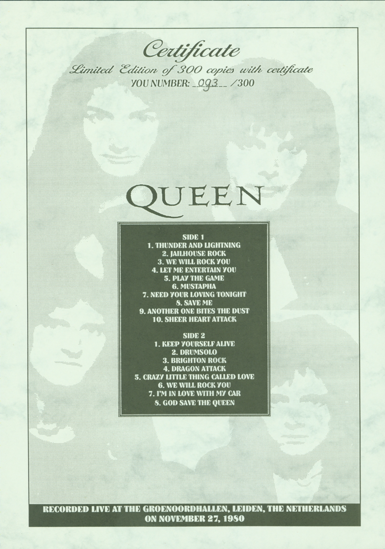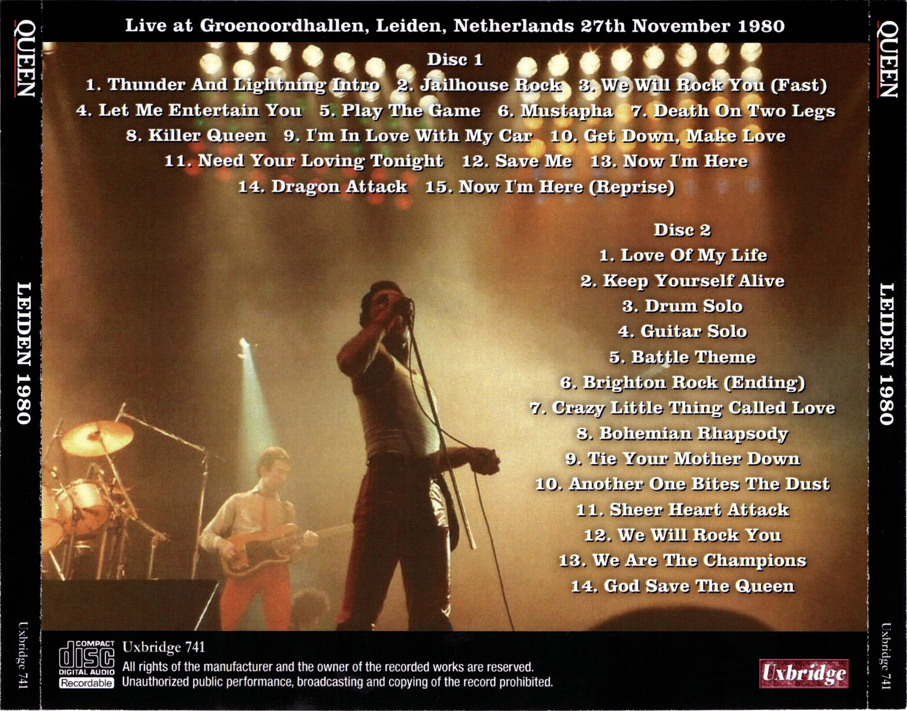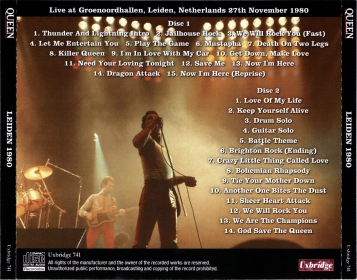| Track listing: | Let Me Entertain You, Play The Game, Mustapha, Death On Two Legs, Killer Queen, I'm In Love With My Car, Get Down Make Love, Need Your Loving Tonight, Save Me, Now I'm Here, Dragon Attack, Now I'm Here (reprise) [cut], Love Of My Life, Keep Yourself Alive, drum/guitar solos, Battle Theme, Brighton Rock (ending), Crazy Little Thing Called Love, Bohemian Rhapsody, Tie Your Mother Down, Another One Bites The Dust, Sheer Heart Attack, We Will Rock You, We Are The Champions [cut] |