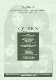 | Track listing: | Jailhouse Rock, We Will Rock You (fast), Let Me Entertain You, Play The Game, Mustapha, Death On Two Legs, Killer Queen, I'm In Love With My Car, Get Down Make Love, Need Your Loving Tonight, Save Me, Now I'm Here [cut], Dragon Attack [cut], Love Of My Life, Keep Yourself Alive, drum/guitar solos, Battle Theme, Brighton Rock (ending), Crazy Little Thing Called Love, Bohemian Rhapsody [cut], Tie Your Mother Down [cut], Another One Bites The Dust, Sheer Heart Attack, We Will Rock You, We Are The Champions [cut] |