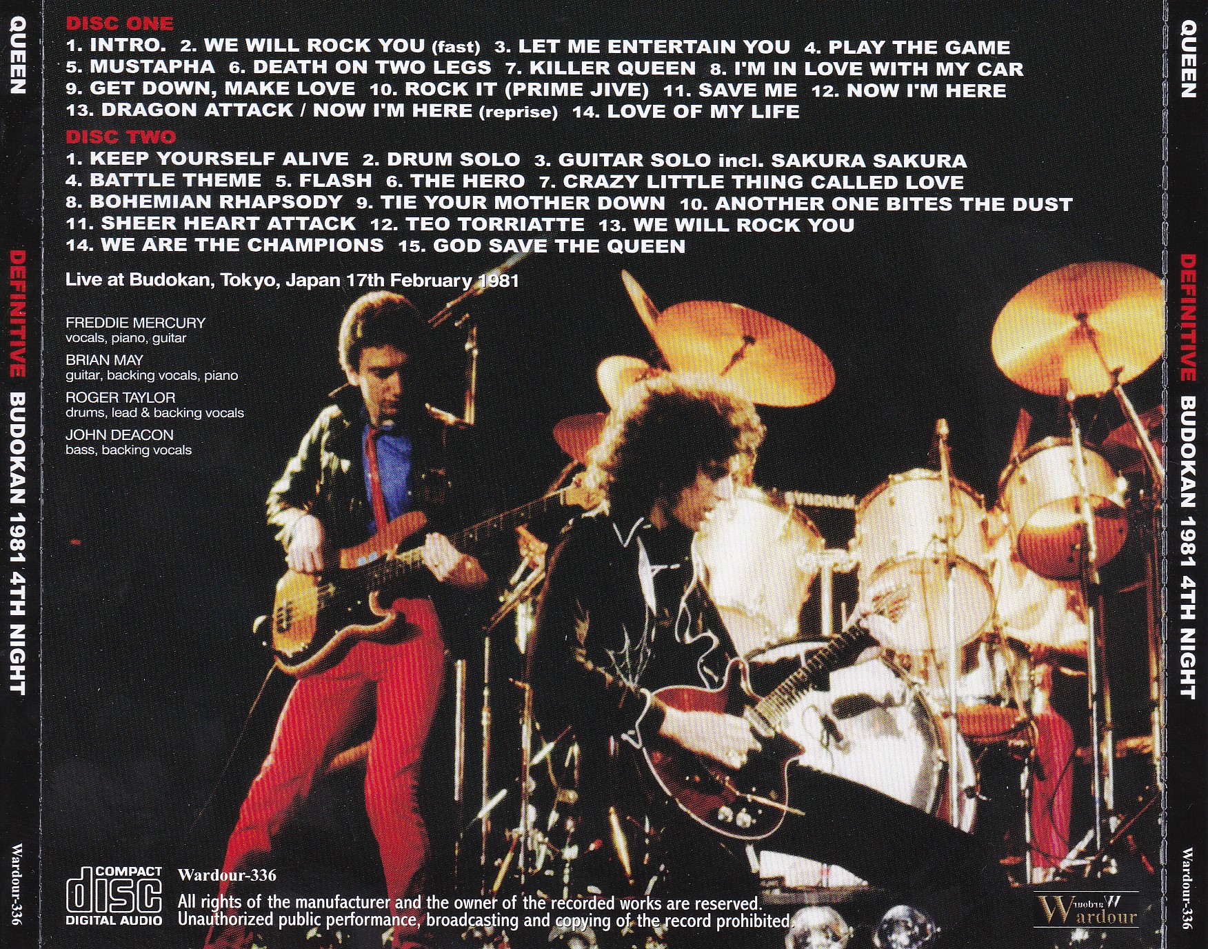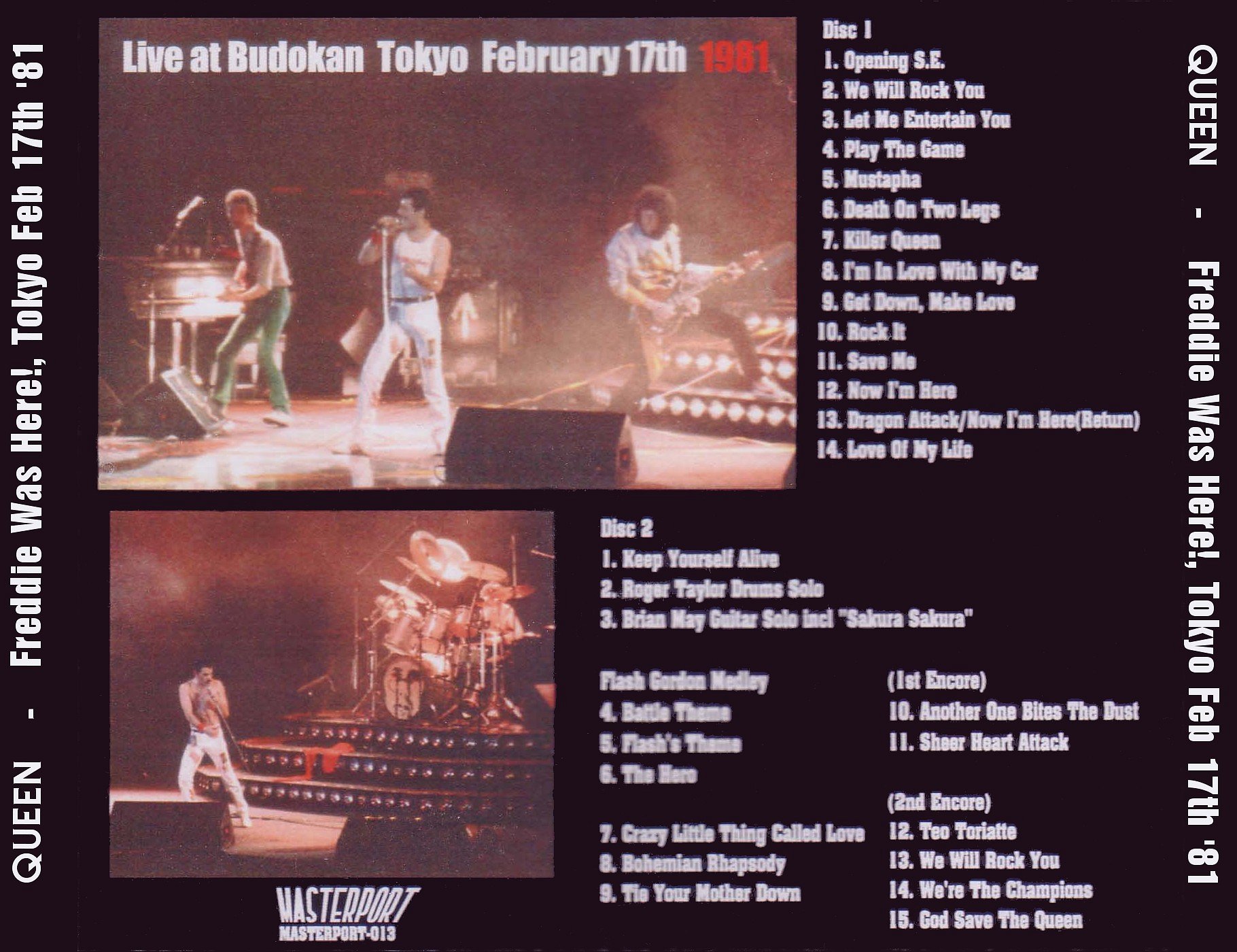 | Track listing: | We Will Rock You (fast), Let Me Entertain You, Play The Game, Mustapha, Death On Two Legs, Killer Queen, I'm In Love With My Car, Get Down Make Love, Rock It, Save Me, Now I'm Here, Dragon Attack, Now I'm Here (reprise), Love Of My Life, Keep Yourself Alive, drum/guitar solos, Vultan's Theme, Battle Theme, Flash [cut], The Hero, Crazy Little Thing Called Love, Bohemian Rhapsody, Tie Your Mother Down, Another One Bites The Dust, Sheer Heart Attack, Teo Torriatte, We Will Rock You, We Are The Champions, God Save The Queen |