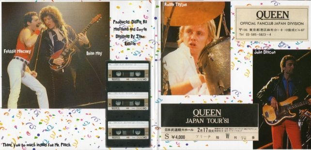 The fast version of We Will Rock You once again begins the show. The band have dropped Jailhouse Rock, probably because they found it wasn't an effective opener in Japan. They would play the Elvis classic a few more times in 1981, retiring it from the opening slot in October. The band have revived Teo Torriatte for the last couple shows at the Budokan. They only play half a verse and three choruses (one in English and two in Japanese). The complete song would only be performed twice in 1982. |