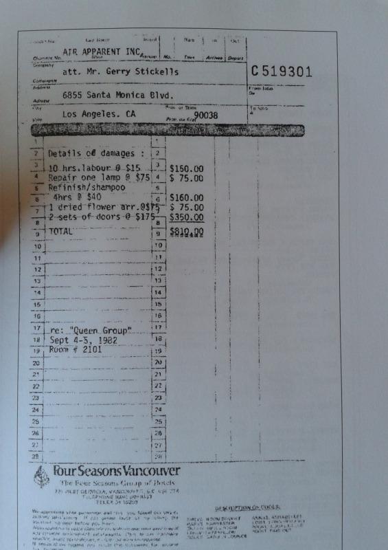Here is a poster for Queen's last concert in Canada, and a review of the show from the September 7th Vancouver Sun. Noting that this was the eve of Freddie Mercury's 36th birthday, here is a scan of the band's hotel bill. The second picture was submitted by Lorrie Hayden, and the last two sets were taken by Gary King and Mark van Manen respectively. |