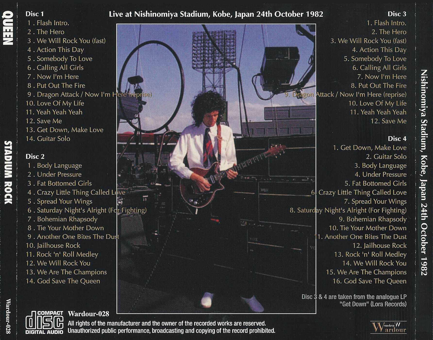 | Track listing: | Flash (tape), The Hero, We Will Rock You (fast), Action This Day, Somebody To Love, Calling All Girls, Now I'm Here, Put Out The Fire, Dragon Attack, Now I'm Here (reprise), Love Of My Life, Save Me, Get Down Make Love, guitar solo, Body Language, Under Pressure, Fat Bottomed Girls, Crazy Little Thing Called Love, Spread Your Wings (part), Saturday Night's Alright For Fighting, Bohemian Rhapsody, Tie Your Mother Down, Another One Bites The Dust, Jailhouse Rock, We Will Rock You, We Are The Champions, God Save The Queen |