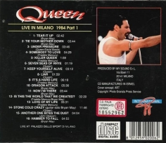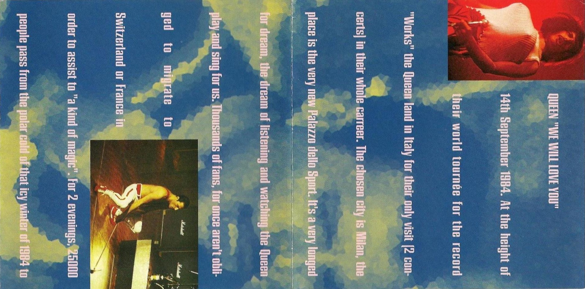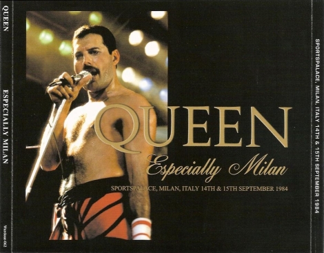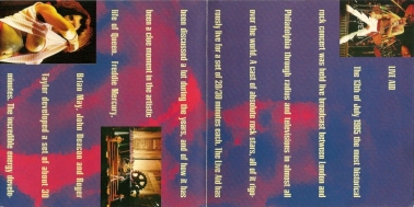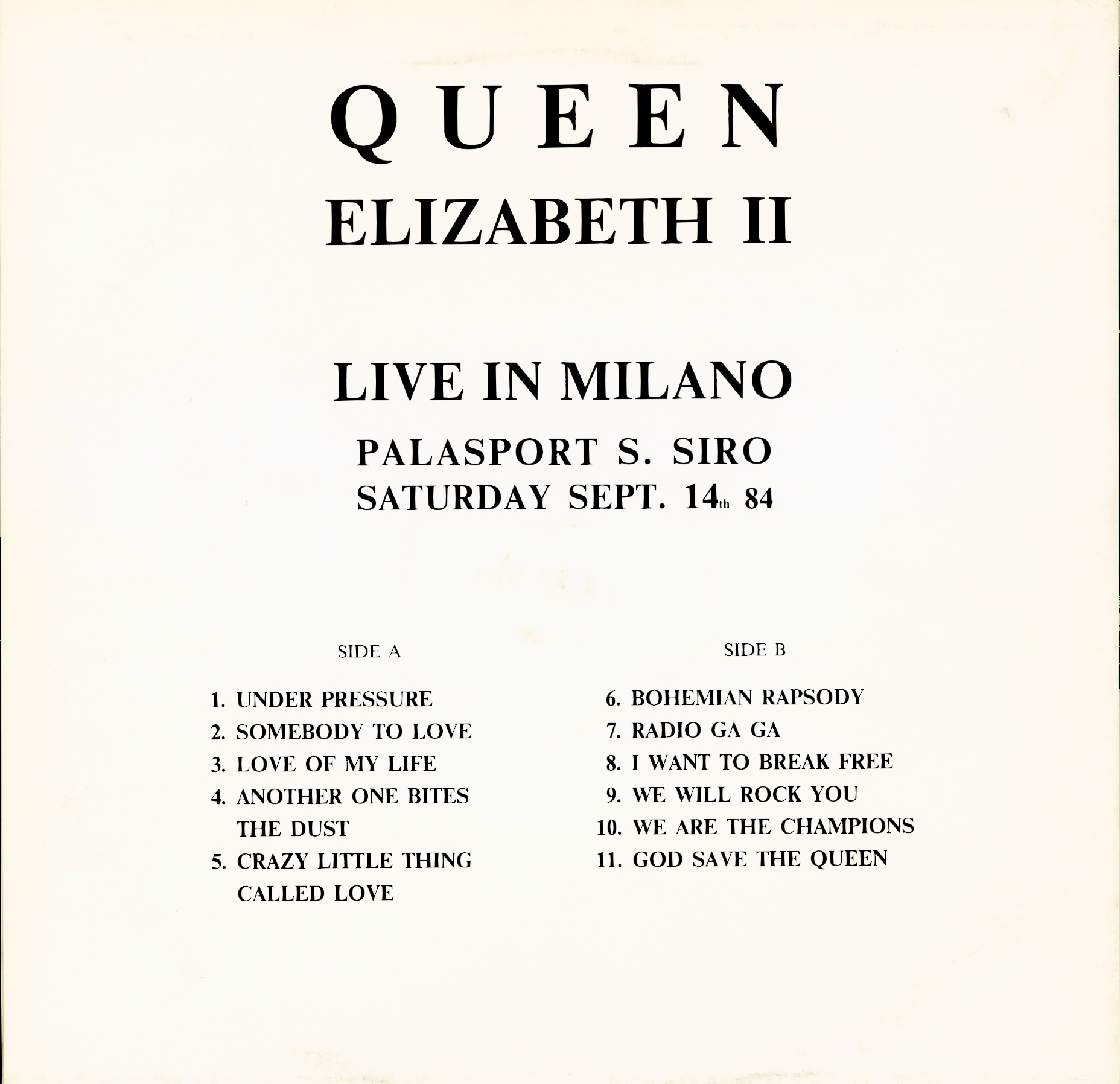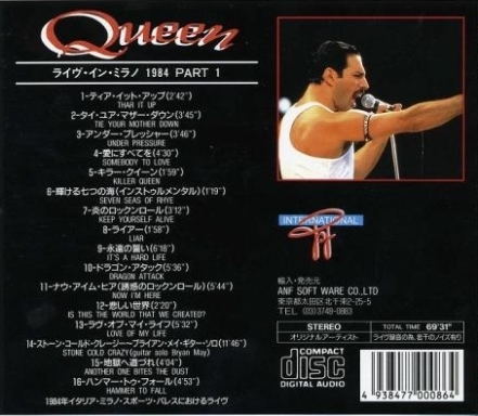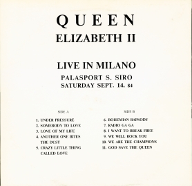 This second audience source is another great quality recording from Milan, first emerging on this bootleg CD in 1992. The date on the CD cover has led to much confusion over the years. Disc 1 and Crazy Little Thing Called Love are from September 15. The rest of disc 2 is from September 14 (hence the given running time of only 76 minutes), except for the TV-sourced Live Aid material tagged onto the end. About 30 seconds into Under Pressure, a young woman in the audience asks in Italian, "Where's David Bowie?" |