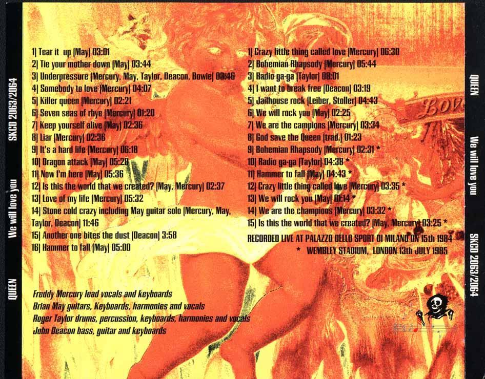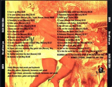 Track listing: | Machines (tape), Tear It Up, Tie Your Mother Down, Under Pressure, Somebody To Love, Killer Queen, Seven Seas Of Rhye, Keep Yourself Alive, Liar, It's A Hard Life, Staying Power, Dragon Attack, Now I'm Here, Is This The World We Created?, Love Of My Life, Stone Cold Crazy, Great King Rat, keyboard/guitar solos, Brighton Rock (ending), Another One Bites The Dust, Hammer To Fall, Crazy Little Thing Called Love, Bohemian Rhapsody, Radio Ga Ga, I Want To Break Free, Jailhouse Rock, We Will Rock You, We Are The Champions, God Save The Queen Machines (tape), Tear It Up, Tie Your Mother Down, Under Pressure, Somebody To Love, Killer Queen, Seven Seas Of Rhye, Keep Yourself Alive, Liar, It's A Hard Life, Mustapha (intro), Dragon Attack, Now I'm Here, Is This The World We Created?, Love Of My Life, Stone Cold Crazy, Great King Rat, keyboard/guitar solos, Brighton Rock (ending), Another One Bites The Dust, Hammer To Fall, Crazy Little Thing Called Love, Bohemian Rhapsody, Radio Ga Ga, I Want To Break Free, Jailhouse Rock, We Will Rock You, We Are The Champions, God Save The Queen |