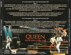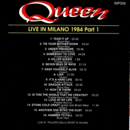 Track listing: | Machines (tape), Tear It Up, Tie Your Mother Down, Under Pressure, Somebody To Love, Killer Queen, Seven Seas Of Rhye, Keep Yourself Alive, Liar, It's A Hard Life, Mustapha (intro), Dragon Attack, Now I'm Here, Is This The World We Created?, Love Of My Life, Stone Cold Crazy, Great King Rat, keyboard/guitar solos, Brighton Rock (ending), Another One Bites The Dust, Hammer To Fall, Crazy Little Thing Called Love, Bohemian Rhapsody, Radio Ga Ga, I Want To Break Free, Jailhouse Rock, We Will Rock You, We Are The Champions, God Save The Queen |