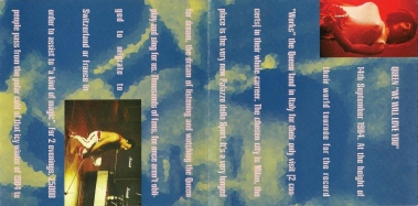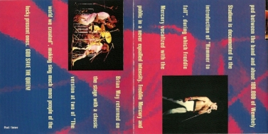 The uncut pre-silver tape of the second audience source emerged in mid-2008, initially bought from the taper a few days after the show. It's a first gen copy, so it has a bit of tape hiss. The first tape runs out after Crazy Little Thing Called Love, and the new tape is damaged for the first few minutes, leaving most of Bohemian Rhapsody in tatters with a flanging effect beyond repair. Freddie's speech introducing Spike Edney is cut for the tape change; along with the Bohemian Rhapsody tape flaws, this explains why the first night was used on the We Will Love You bootleg from this point onward. Brian's brief speech before Is This The World We Created is cut for a tape flip as well (a longer cut than on the first source). |