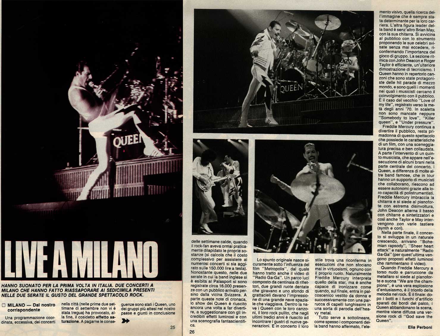 Freddie sounds great tonight as he did last night. The audience chant for Mustapha again tonight, and Mercury sings the intro. "That's all they're gonna fuckin' get," he says afterward. Brian then plays a few riffs that resemble Freddie's piano part, before Roger launches the band into Dragon Attack. The Mustapha intro would become a regular thing on the Works tour, like it was in 1979. Before the big fanfare at the end of Now I'm Here, Freddie shouts, "Sock it to them, Roger!" During the day, Brian learns a few words of Italian and speaks to the audience in their native tongue during the acoustic part of the evening. The gesture is much appreciated. During Love Of My Life, he plays a beautiful version of Brahms' Lullaby like he did in London last week. The Sport Palace would collapse under snow just a few months later. Whether or not this impacted Queen's decision to skip out on Italy for the Magic Tour is unknown. Here is a review of the shows (in Italian), submitted by Alessio Rizzitelli. The second pic was submitted by Fabio Tosti. |