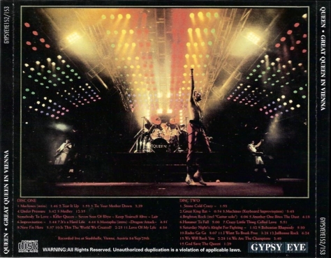 Track listing: | Machines (tape), Tear It Up, Tie Your Mother Down, Under Pressure, Somebody To Love, Killer Queen, Seven Seas Of Rhye, Keep Yourself Alive, Liar, It's A Hard Life, Mustapha (intro), Dragon Attack, Now I'm Here, Is This The World We Created?, Love Of My Life, Stone Cold Crazy, Great King Rat, keyboard/guitar solos, Brighton Rock (ending), Another One Bites The Dust, Hammer To Fall, Crazy Little Thing Called Love, Saturday Night's Alright For Fighting [cut], Bohemian Rhapsody, Radio Ga Ga, I Want To Break Free, Jailhouse Rock, We Will Rock You, We Are The Champions, God Save The Queen |